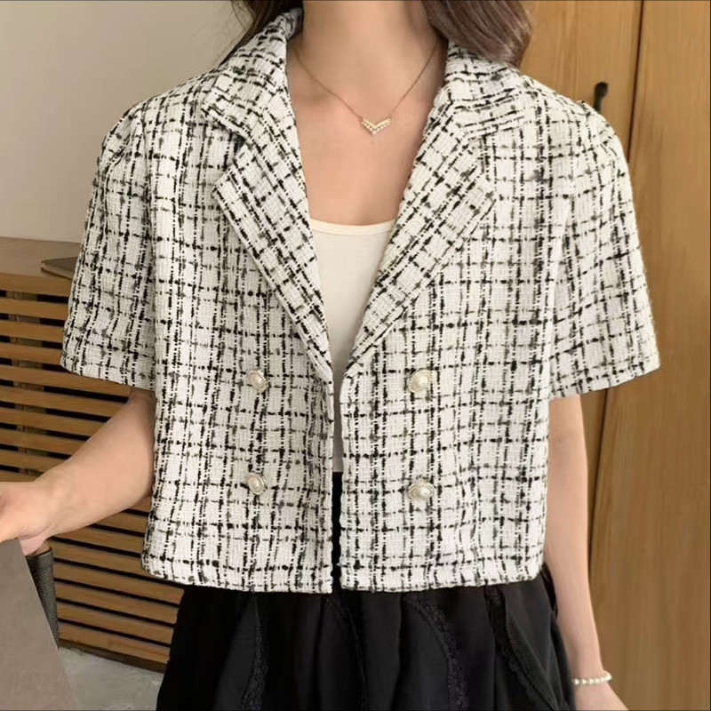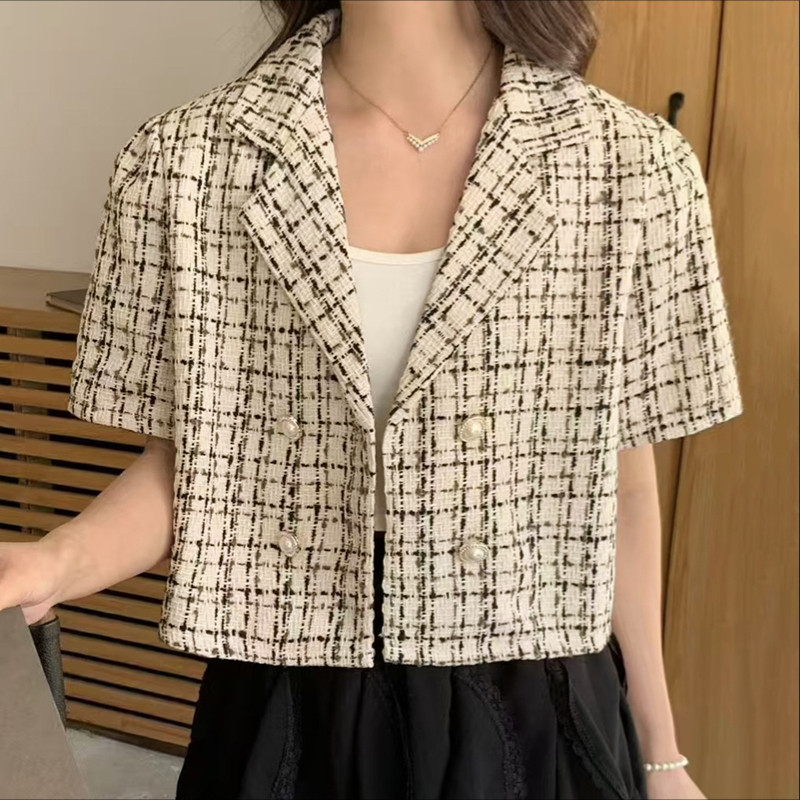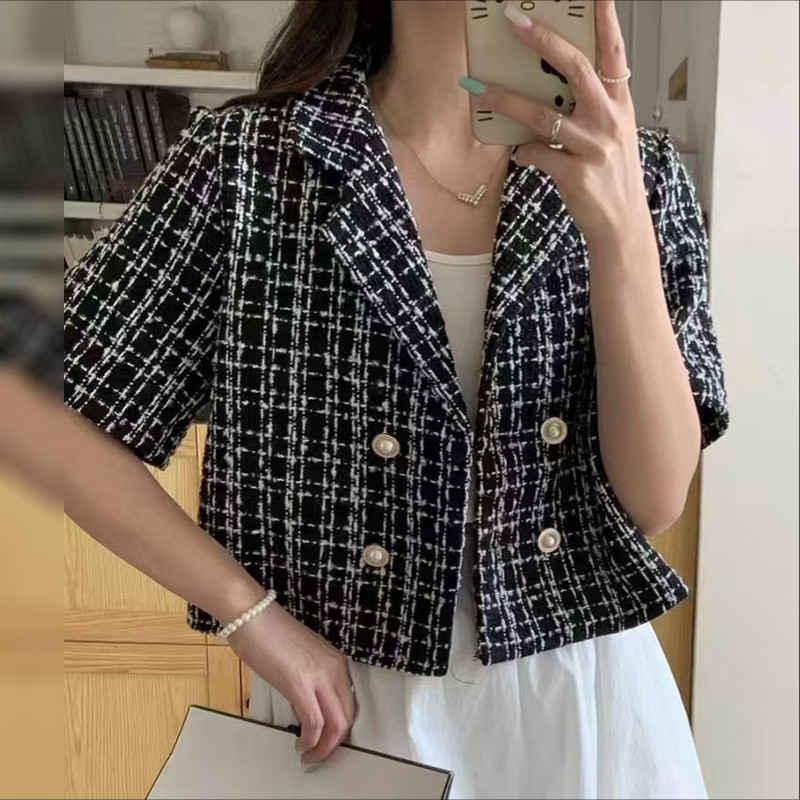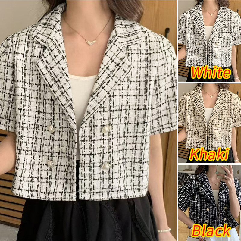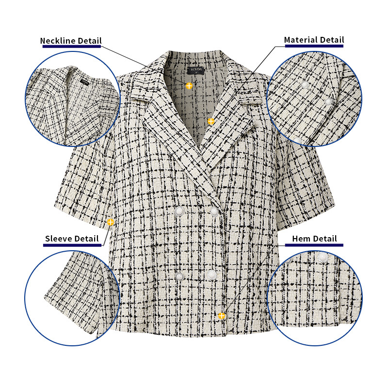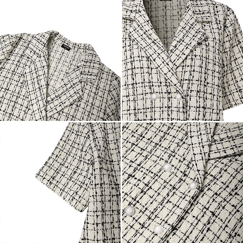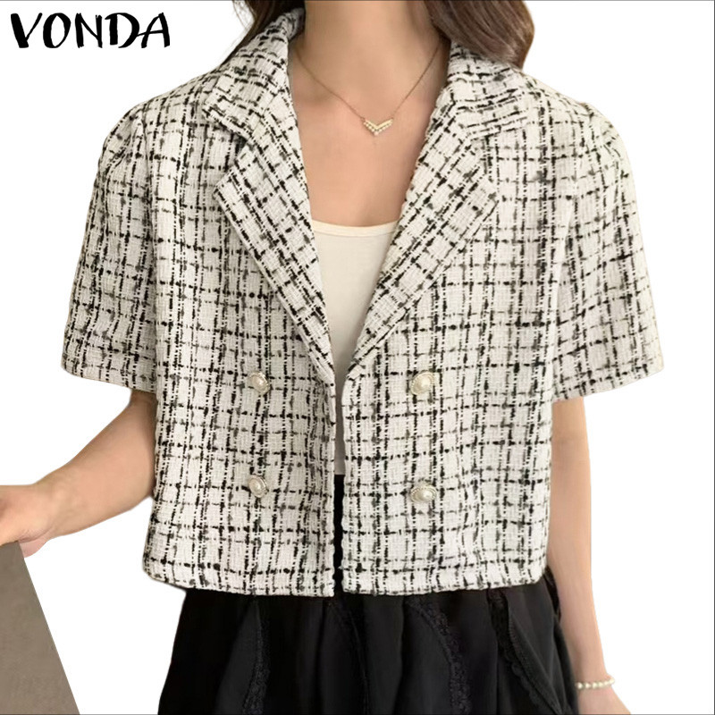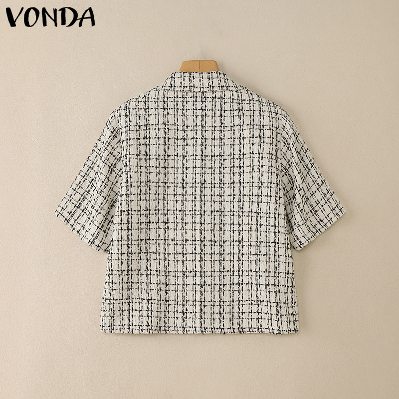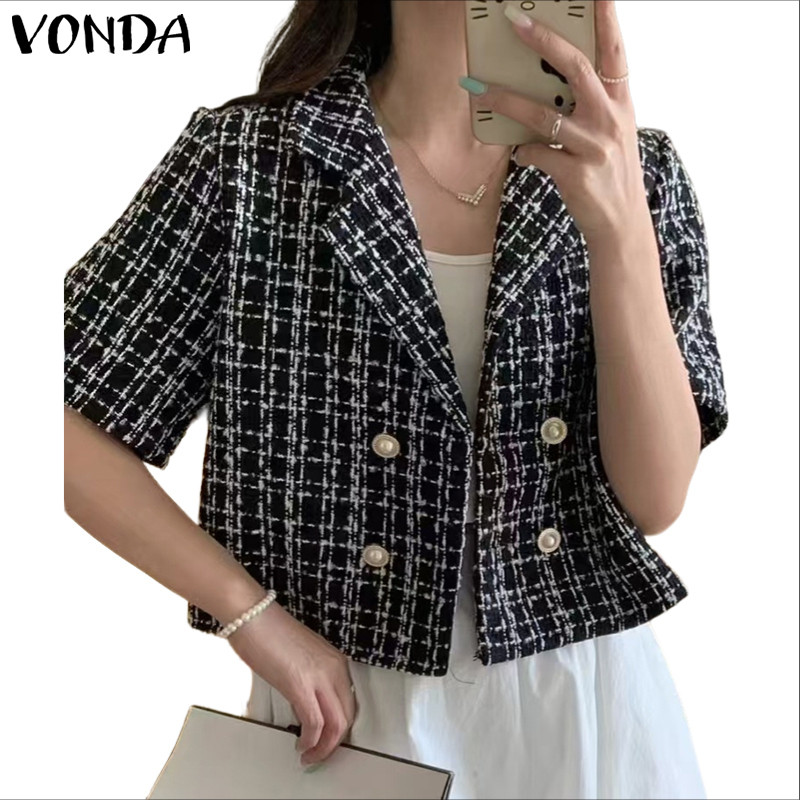 VONDA Women Korean Formal Office OL Suie Neck Double-Breasted Plaid Cardigan