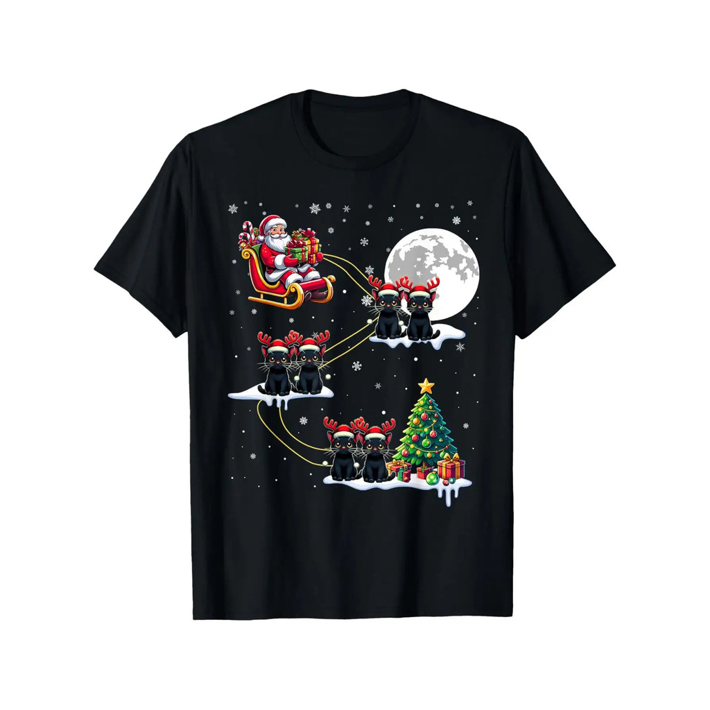 180g FunnySantaRidingBlackCatChristmasT-Shirt, 100%, FestivePatternwithReindeerandSnowflakes, Unisex