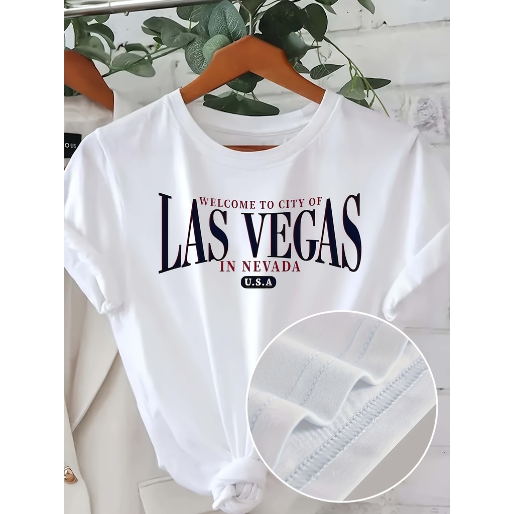 1pc Women'S Casual Round Neck Short Sleeve T-Shirt with "Welcome to City of Las Vegas in Nevada U.S.