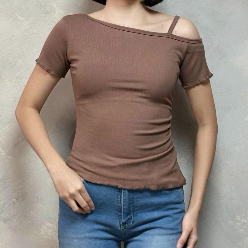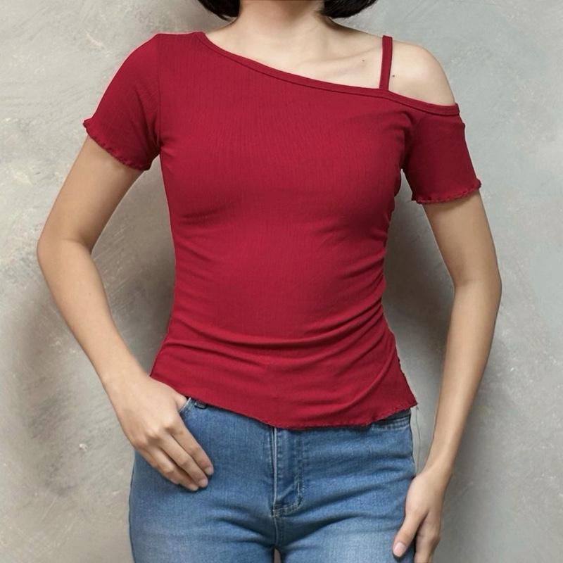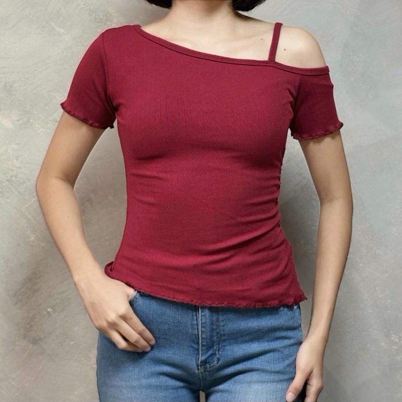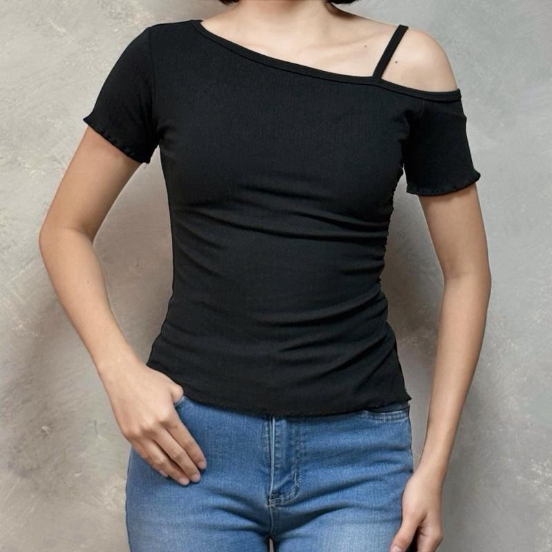 HEY ZOEY Verona Top | Asymmetric Shoulder Raw Hem Side Ruched Short Sleeve One Strap Design Korean S