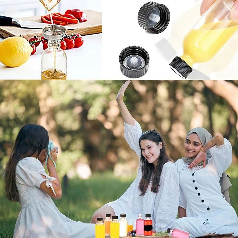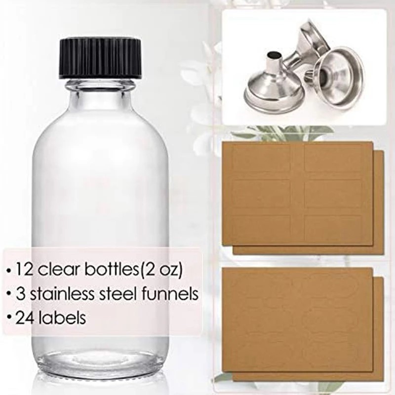 12Pc Glass Bottles with Lids 3 Funnels Reusable 60mL Clear Glass Bottles Juice, Whiskey, Oils