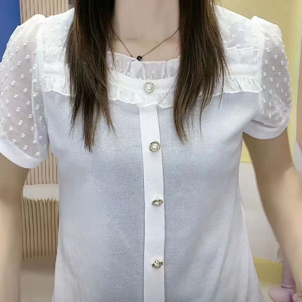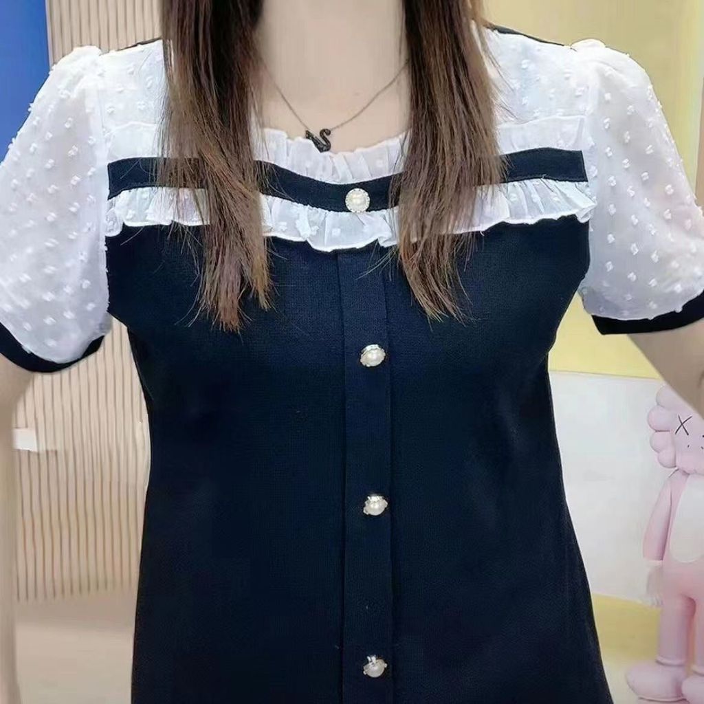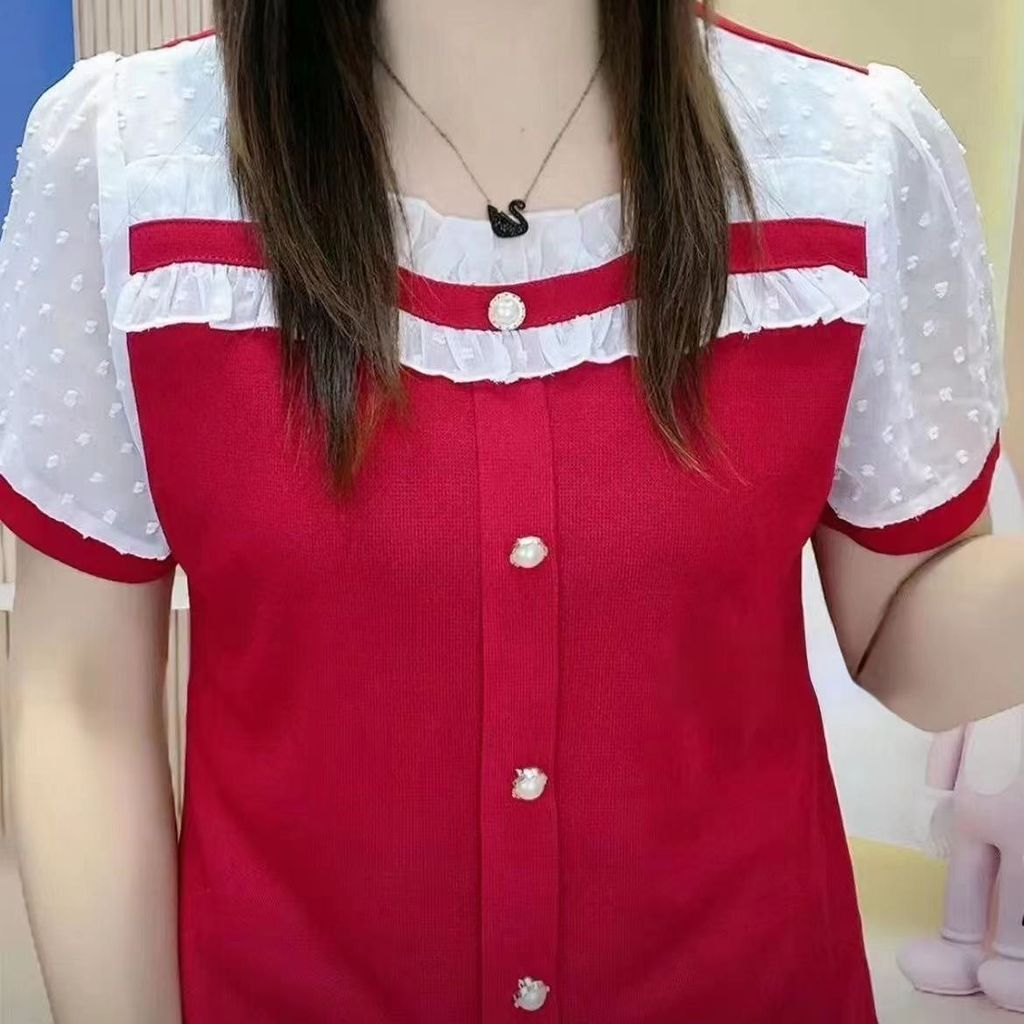 Summer new style fashionable loose and slimming versatile square collar splicing short sleeved T-shirt for women