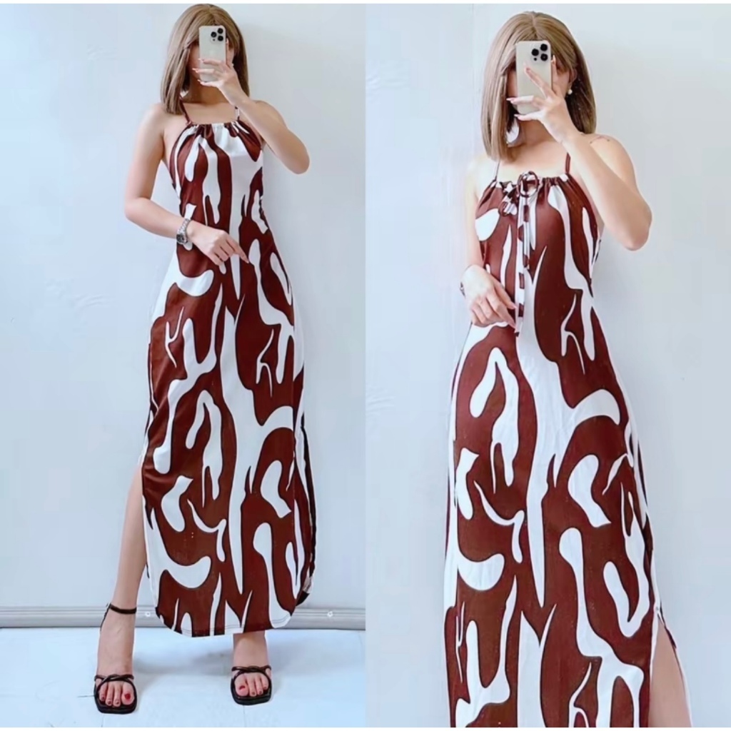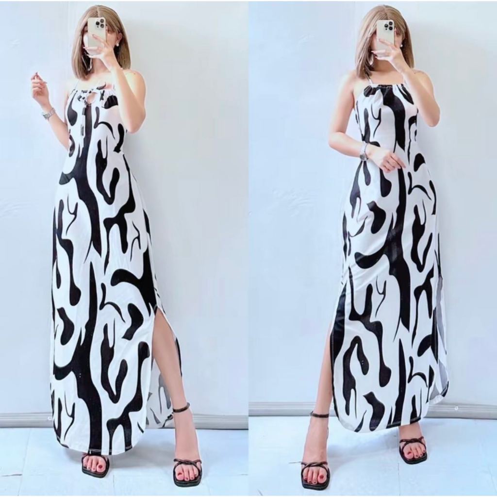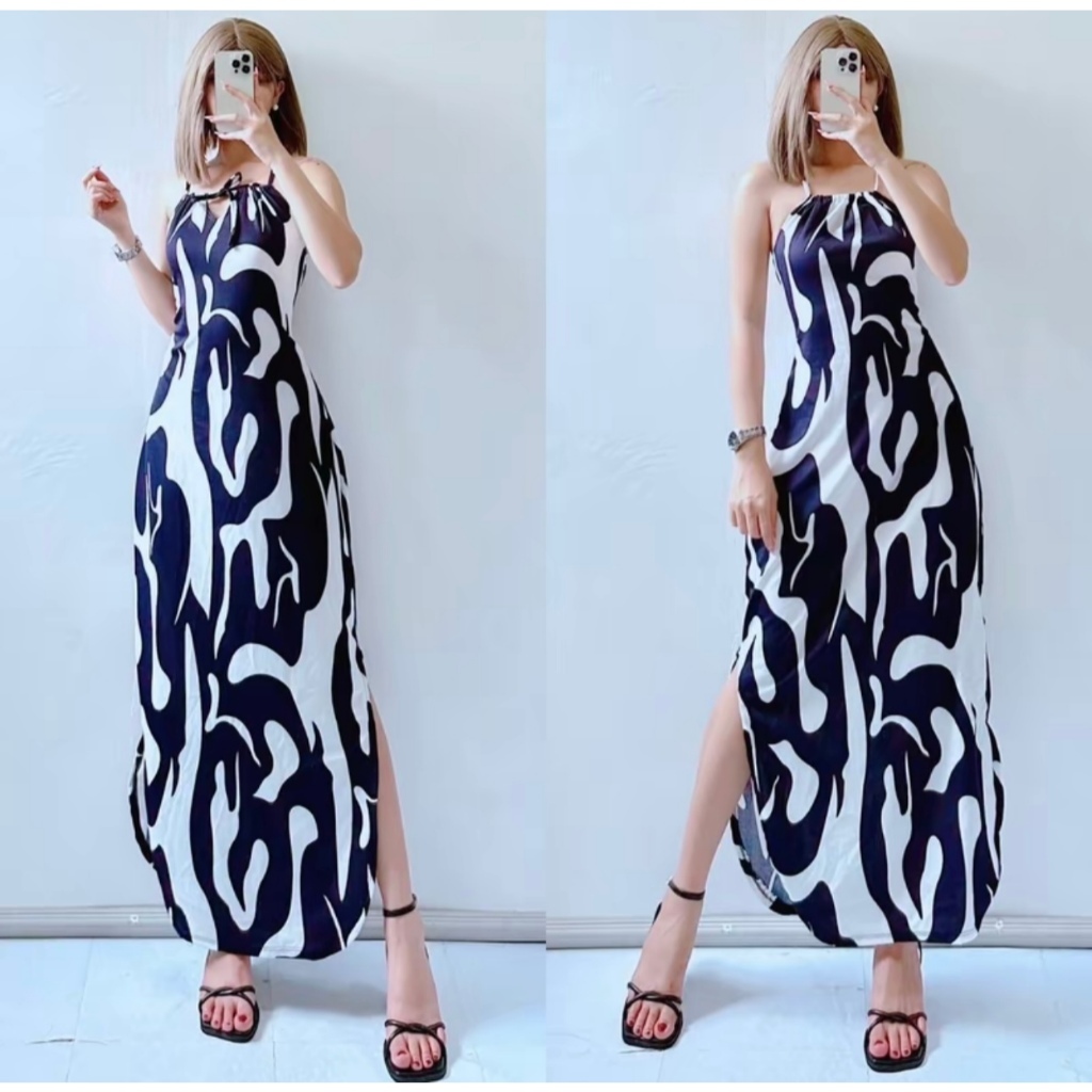 Emily Glaiza Frenchy Women Casual Slit Hem Long Dress Halter Neck Side Slit Tie Strap Maxi Dress