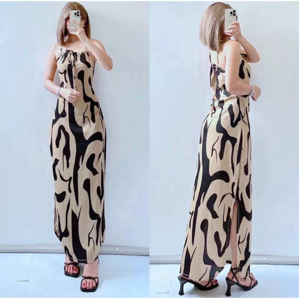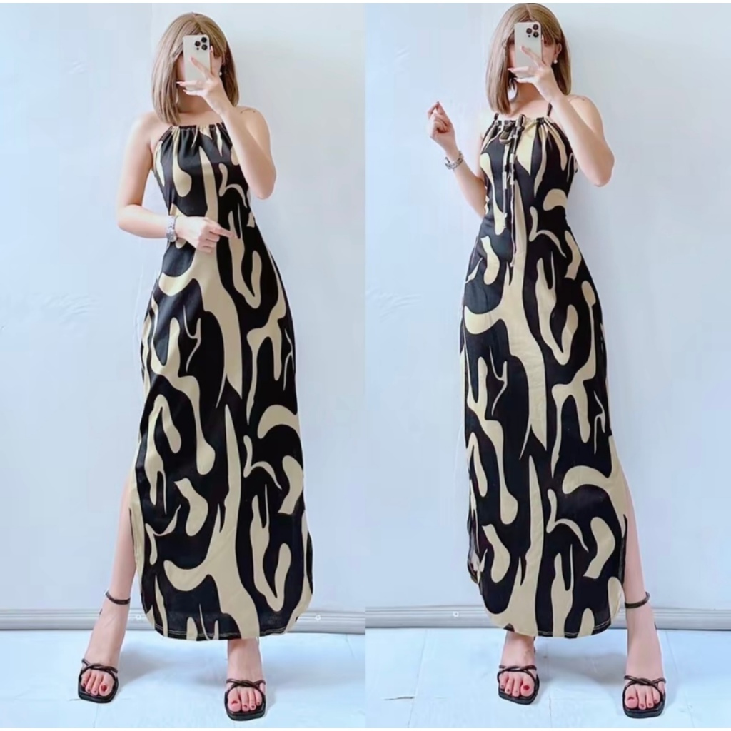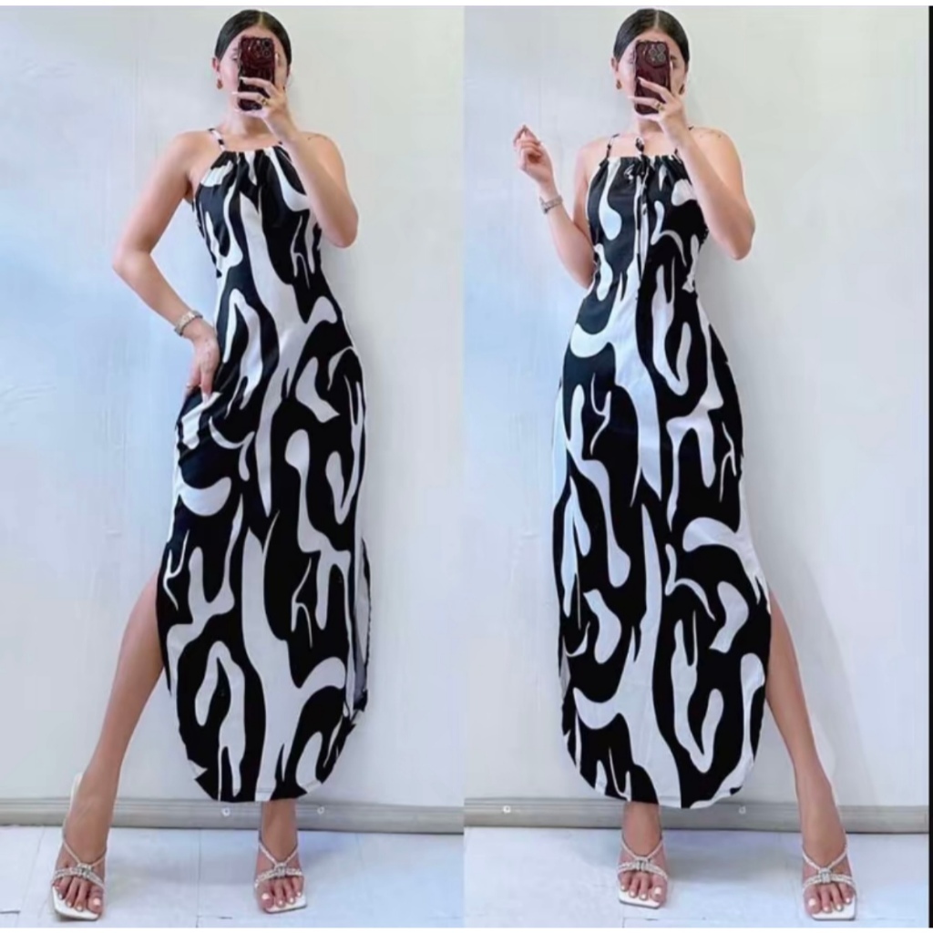 Emily Glaiza Frenchy Women Casual Slit Hem Long Dress Halter Neck Side Slit Tie Strap Maxi Dress