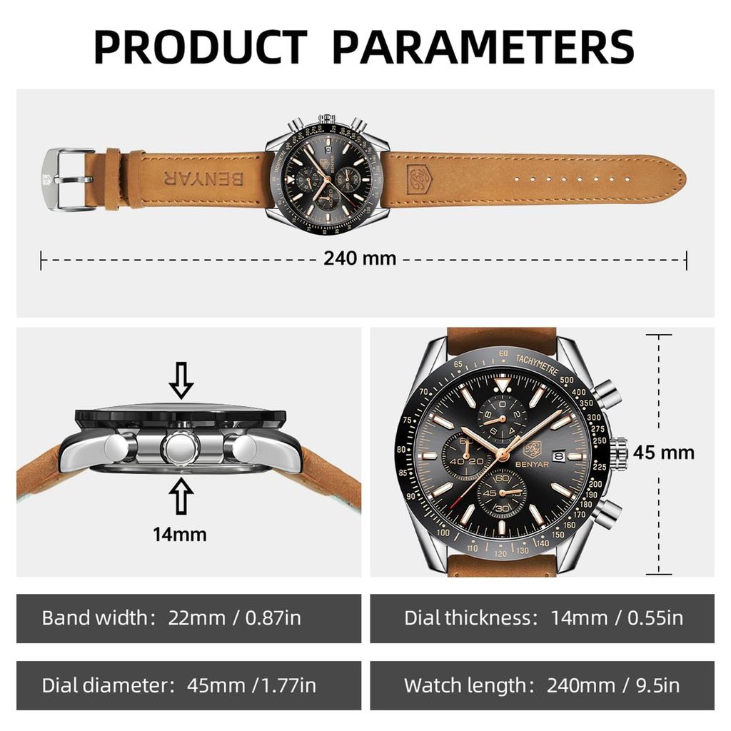 BY BENYAR Men's Chronograph Analog Watch, 30M Water Resistant, Simple, Stylish, Popular, Formal, Leather Strap Quartz Movement, Gift for Men, Available in Brown, Silver, and Black 【Direct from Japan】
