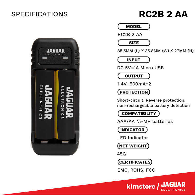 Jaguar Electronics Rc2b 2-Slot Usb Charger With 2 Rechargeable Batteries Ab2