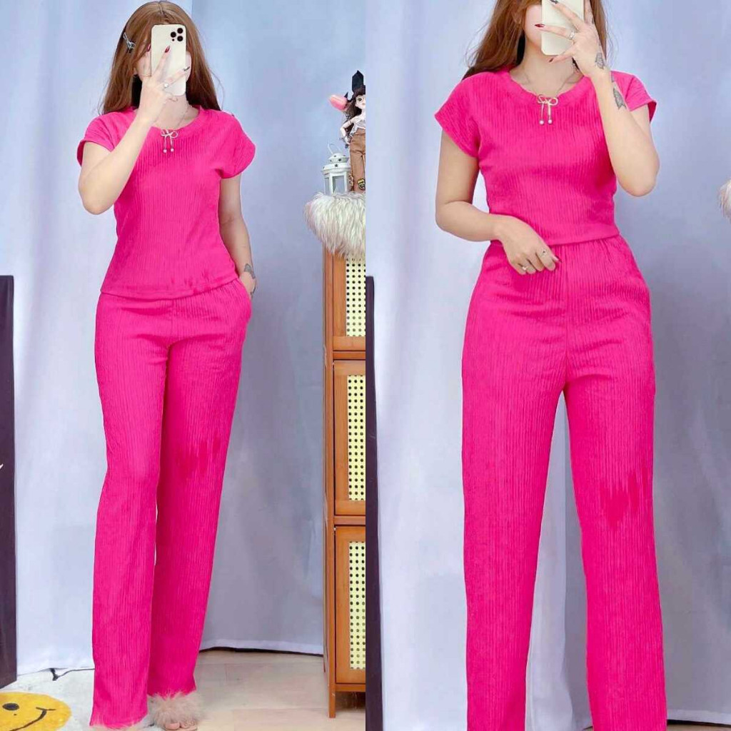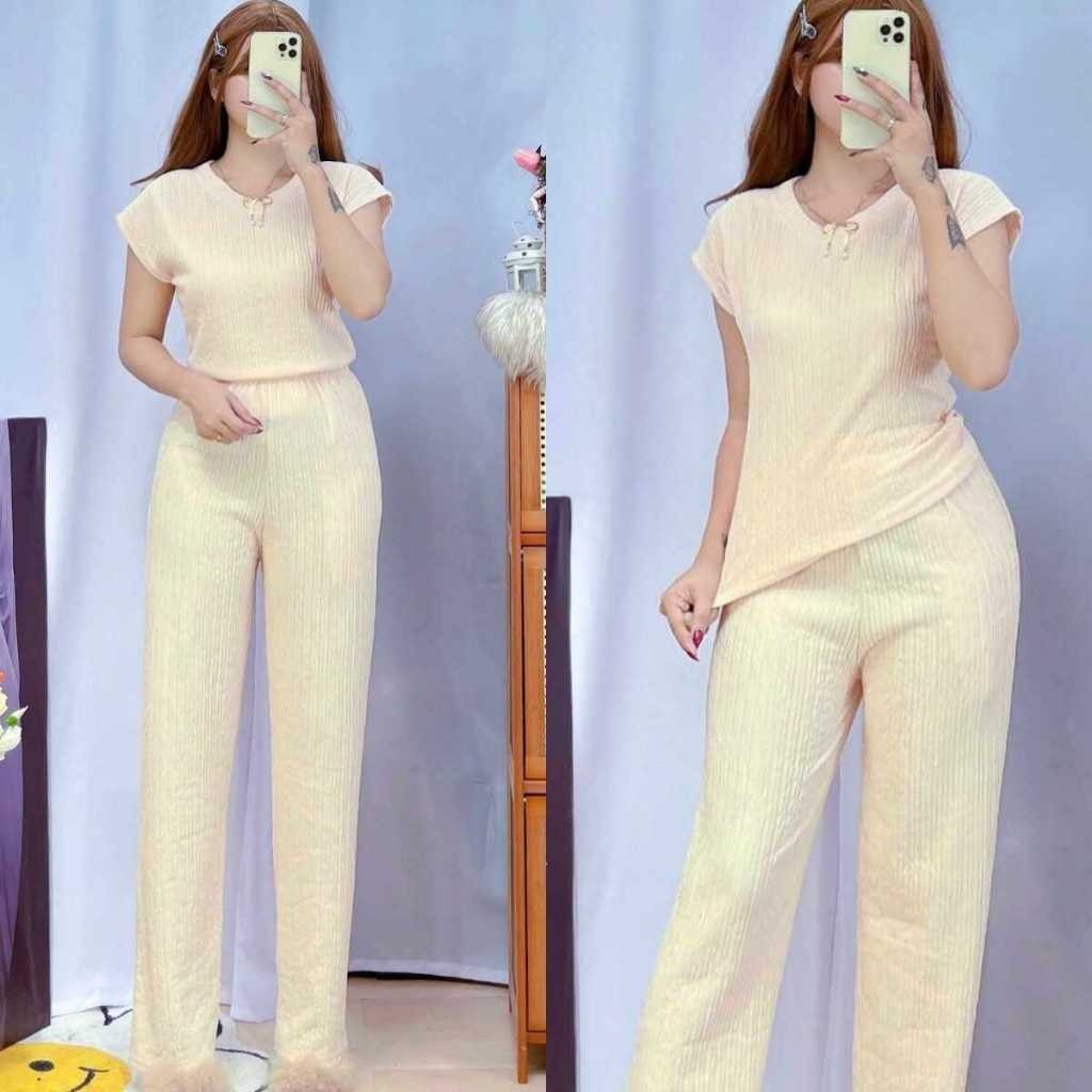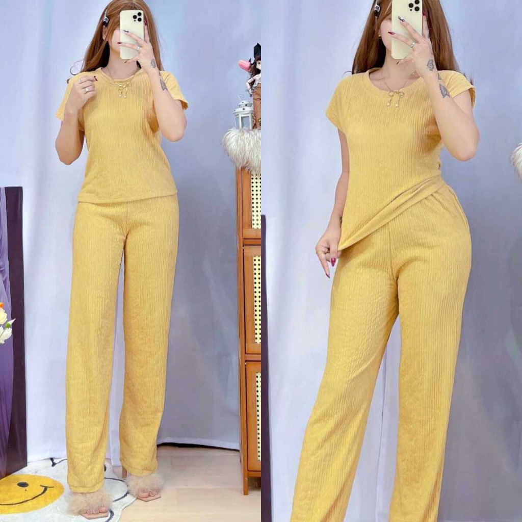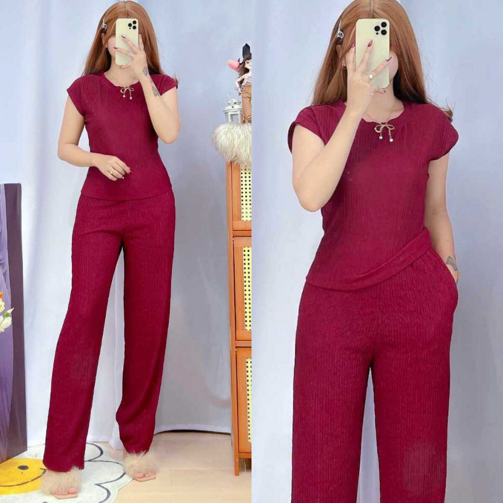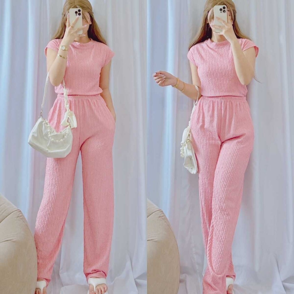 Jenny Plain Basic Round Neck Top Continues Terno Pants Coords Set Trendy Women Casual