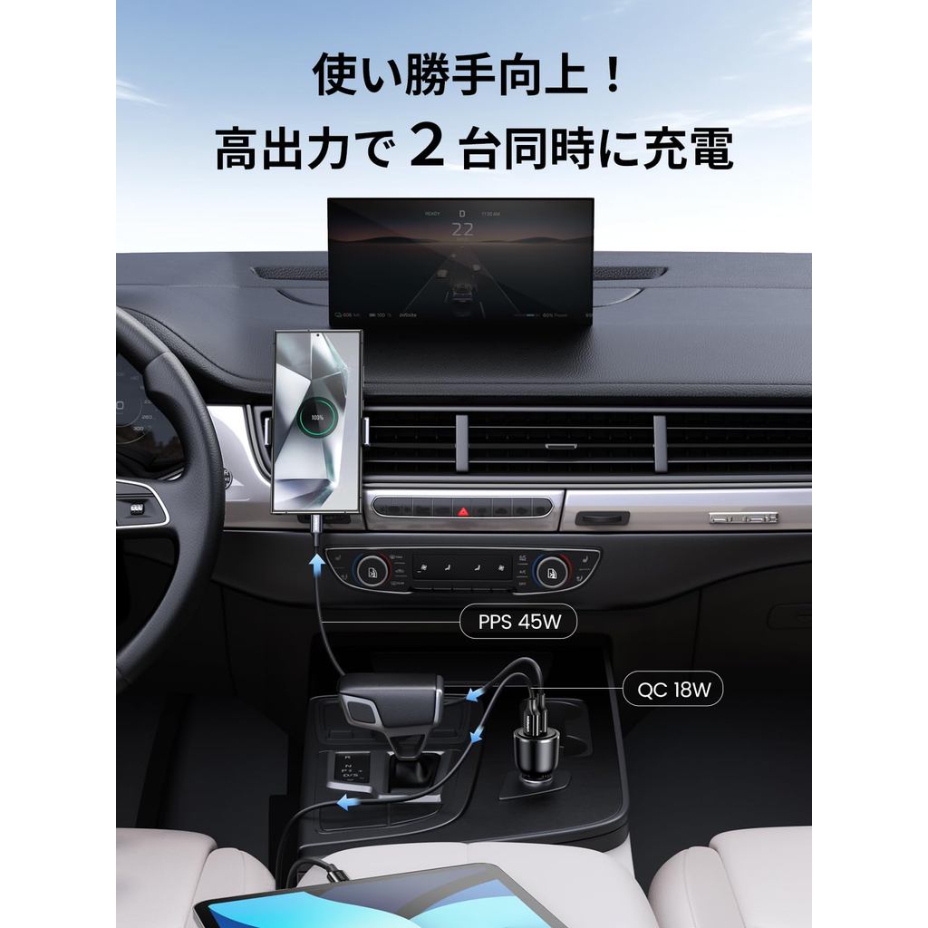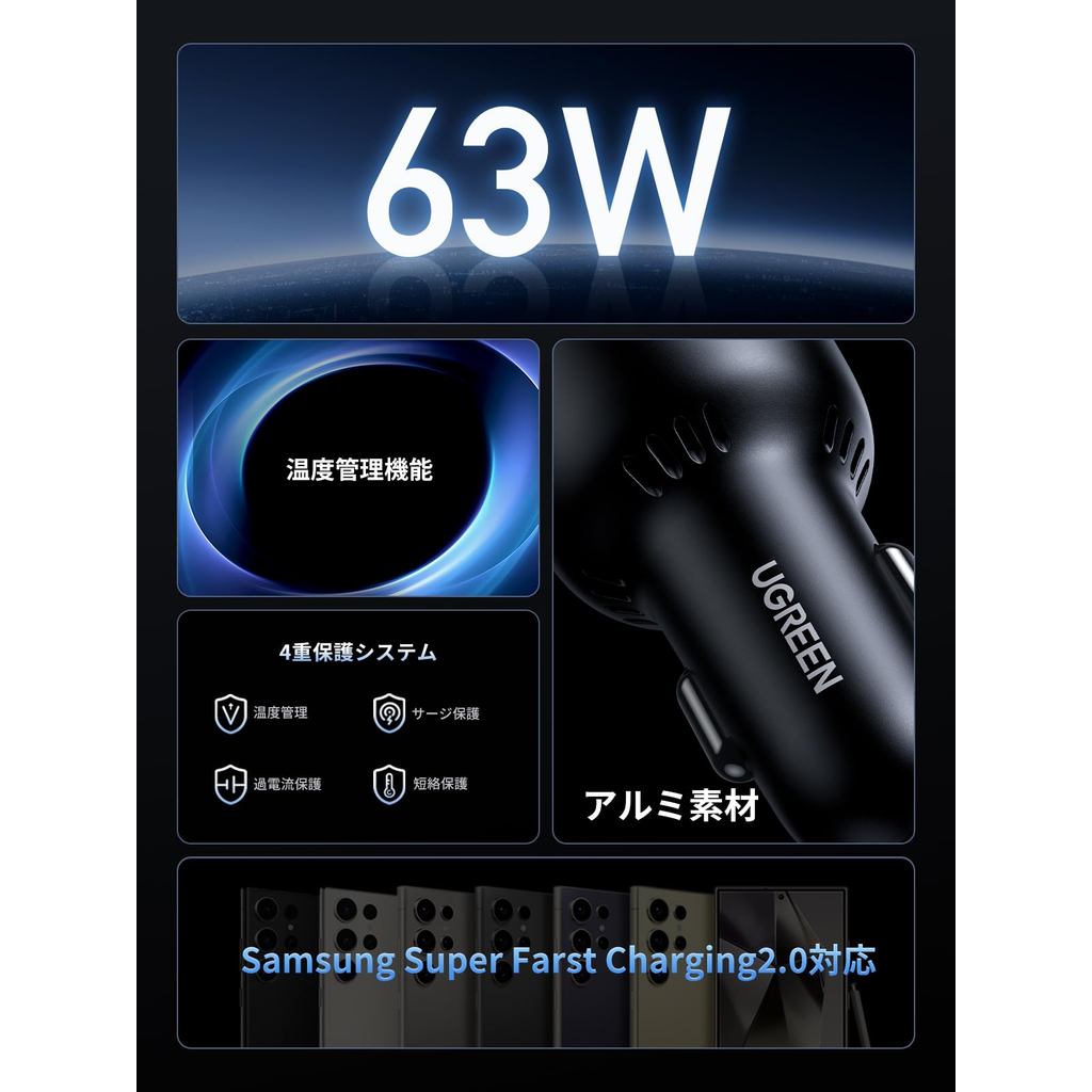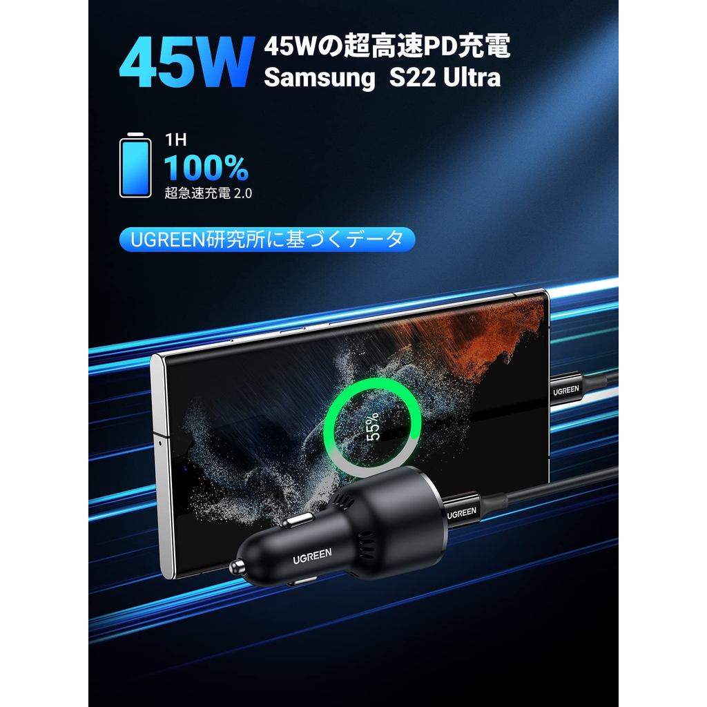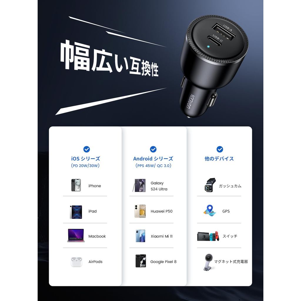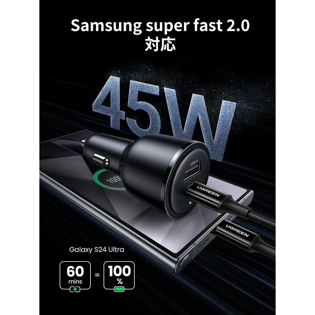 UGREEN 63W Cigarette Lighter Socket, 2 Ports [45W PD + 18W QC], USB-A + USB-C, QC3.0 & PD3.0 Compatible, Fast Charging, PSS, DC12V-24V Vehicle Compatible, iPhone 17/14 Pro Max/iPhone 13/12 Pro/11 Pro Max/XR/8, iPad, Galaxy, Xperia, and Other Android Devi