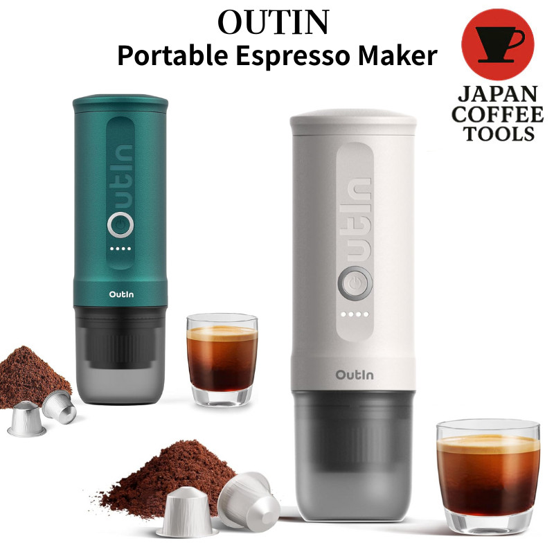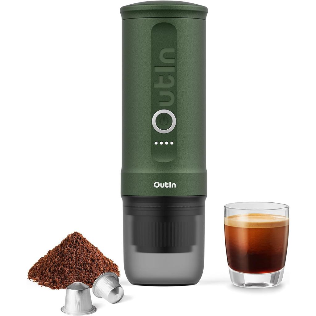 OutIn Nano Portable Electric Espresso Machine - Self-Heating Travel Coffee Maker for Camping, Car, RV, Hiking, and Office Use with USB-C Compatibility and Freshly Ground Coffee & NS Capsules (Various Colors)