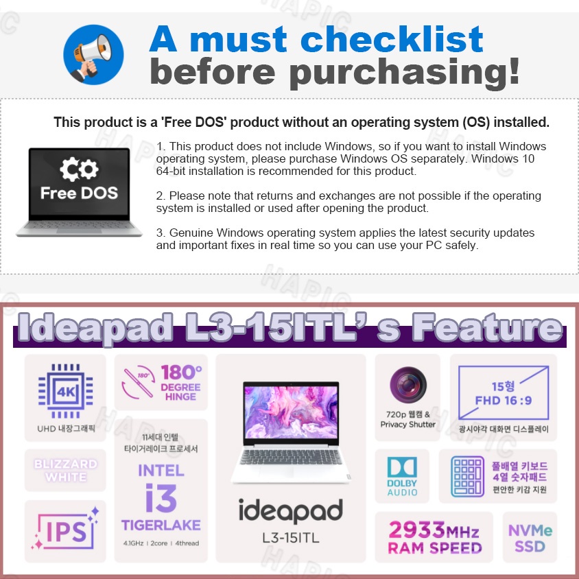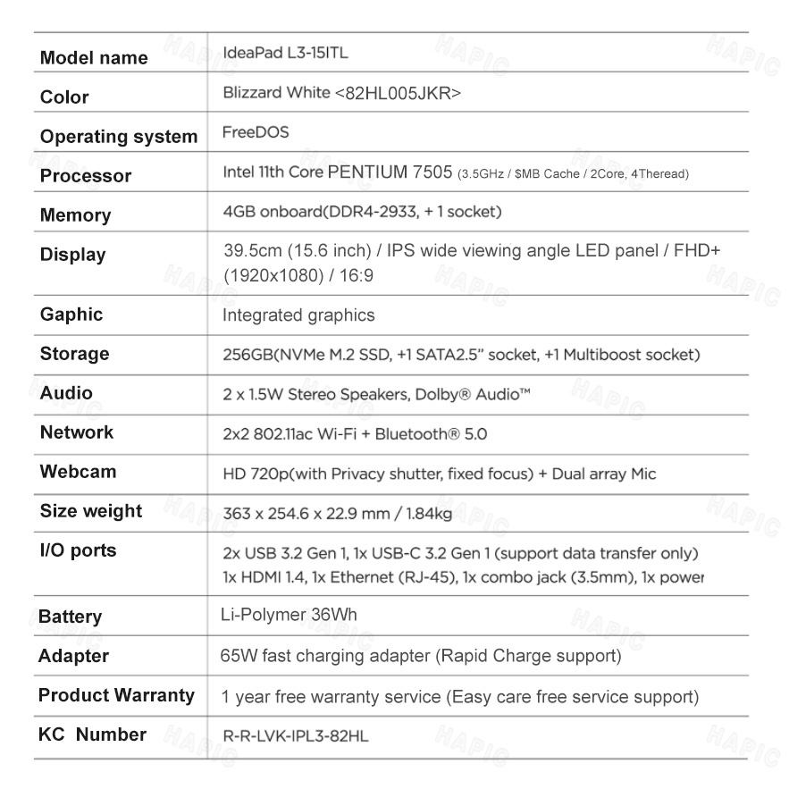[Lenovo] laptop ideapad L3-15ITL Blizzard White pentium 7505 *Windows is not included*