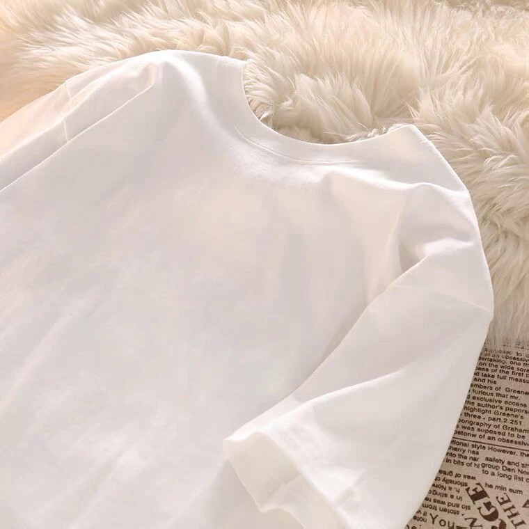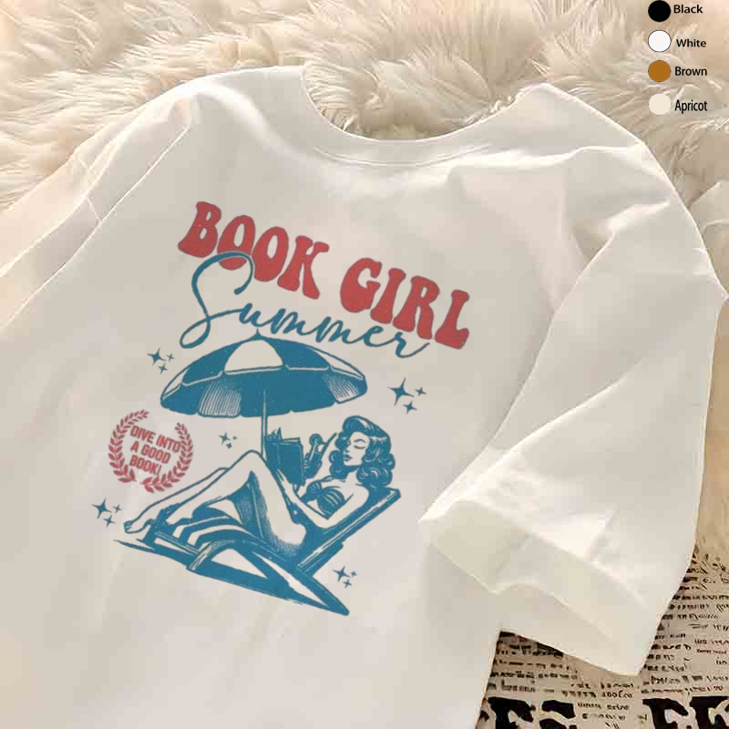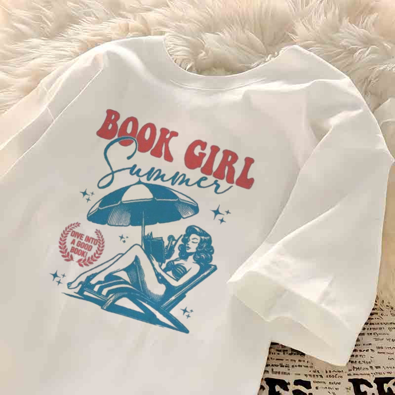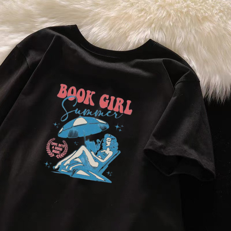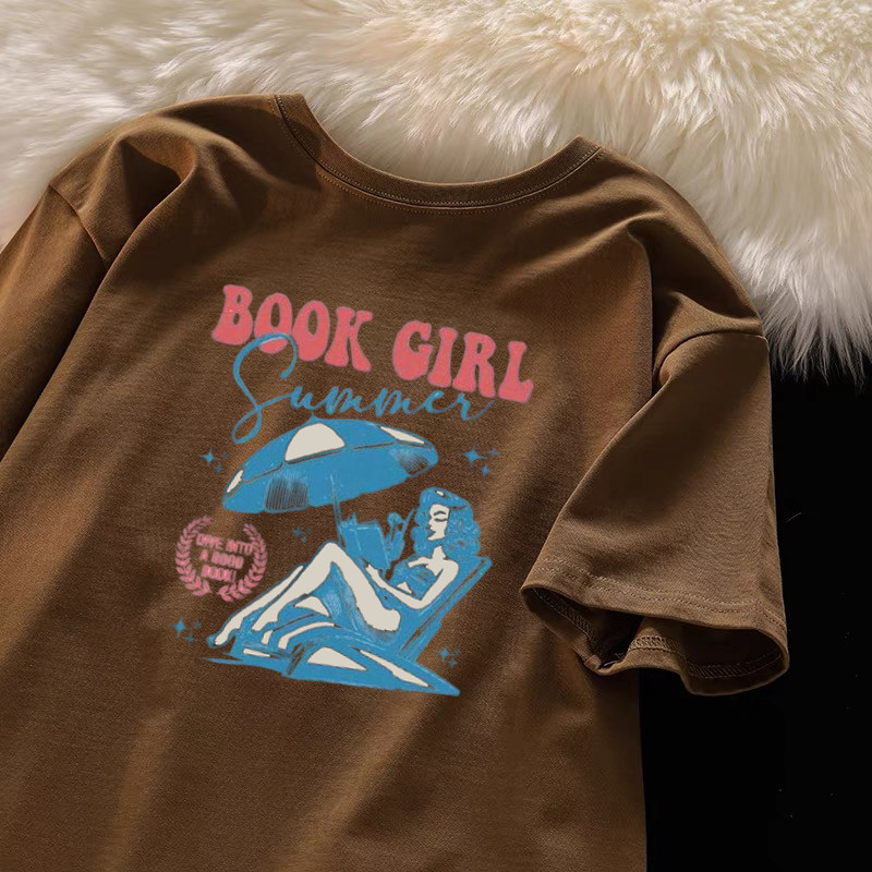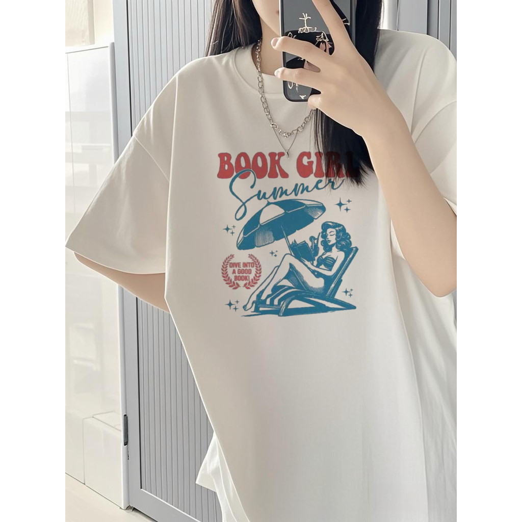 Korean loose large size round neck design beach girl theme printed cotton T-shirt for woman