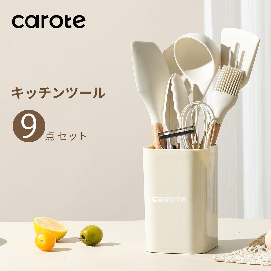 CAROTE Kitchen Tool Set 9 Pieces Silicone Cooking Utensil Set Spatula, Ladle, Tongs, Whisk, Turner, Basting Brush, Shallow Spoon, Peeler, Tool Stand High Heat Resistance Beige (9-Piece Set) [Direct from Japan]