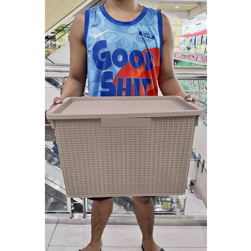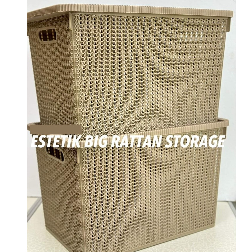#6205 BROWN XL RATTAN WOVEN BASKET STORAGE ORGANIZER PLASTIC WITH COVER W17.5xL12xH11.5inches