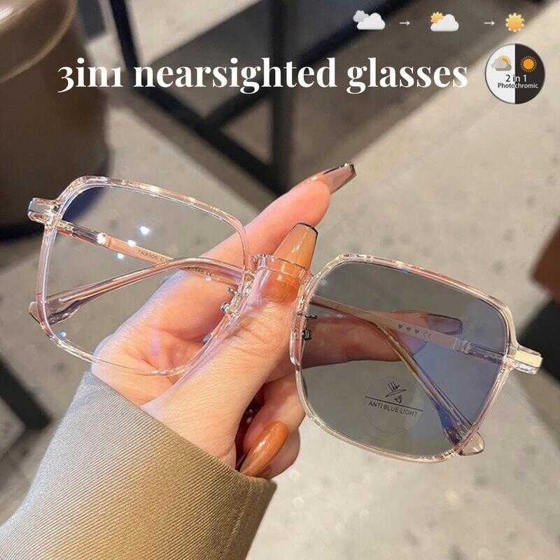 3In1 Nearsighted Glasses Photochromic Myopia Fream Anti Radiation Square Fashion Eye fyg