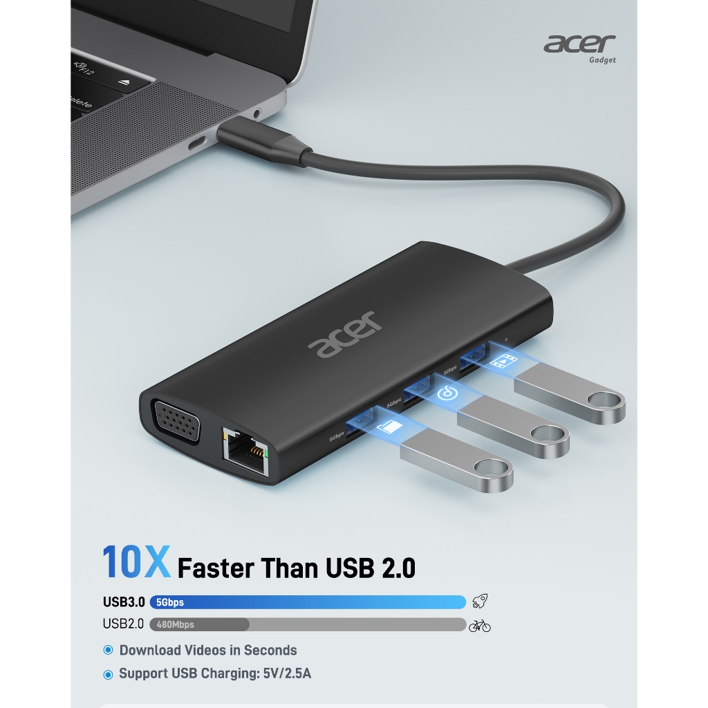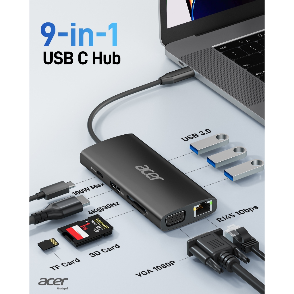 Acer USB Hub Type C with 4K HDMI 9-in-1 USB C to Ethernet Adapter 5Gbps USBA 3.0 Docking Station VGA Splitter SD Card Reader PD 100W Charging for MacBook Laptop Stand With Docking Station