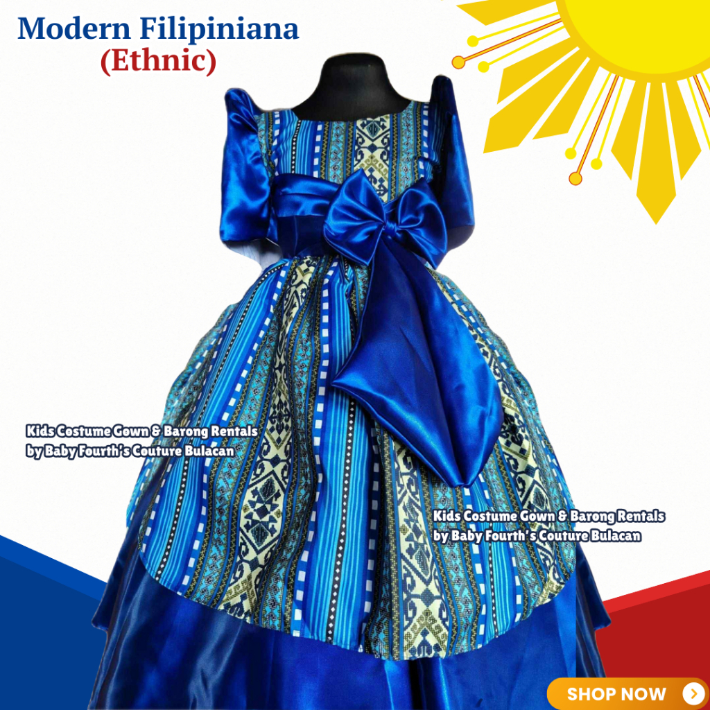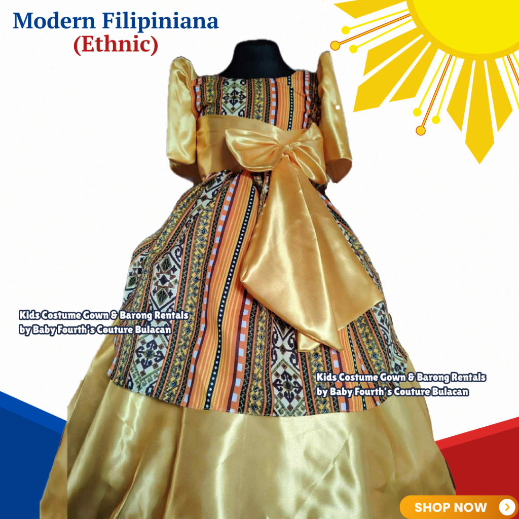 Buwan ng Wika Modern Ethnic Filipiniana Gown with Big Ribbon – Cultural Dress for Kids