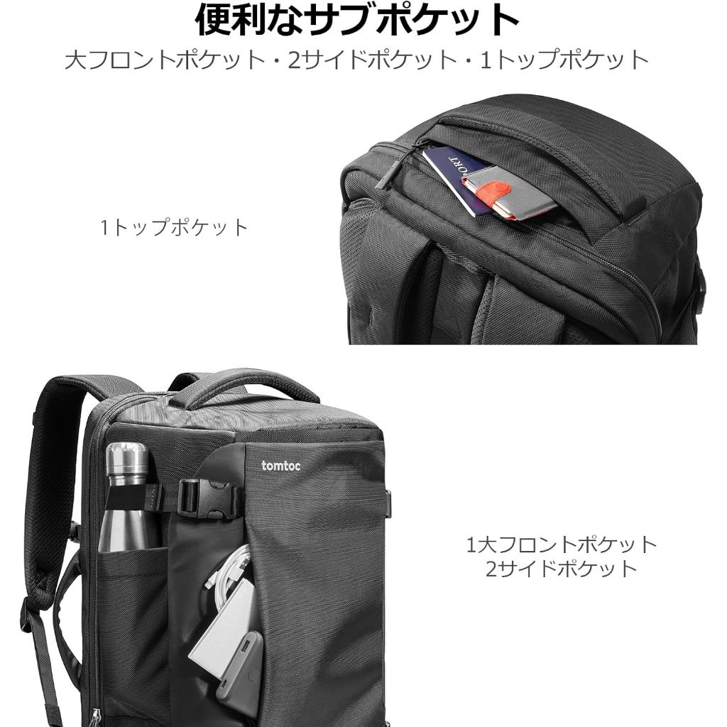 [tomtoc] Travel Backpack, Large Capacity, Carry-On, Business Backpack, Travel Bag, Rucksack, Men's, Multi-Functional, Compatible with 17.3-inch PC, Water-Repellent, Black,〘 Shipped from Japan〙