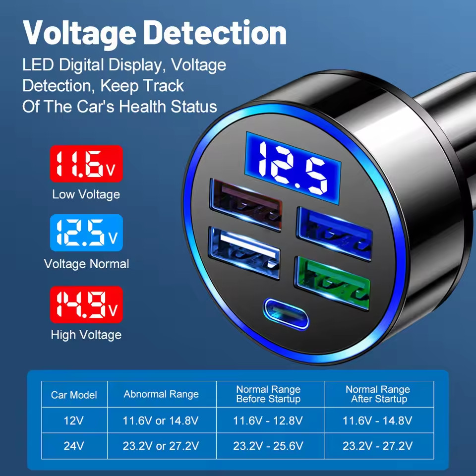250W 5-Port Car Charger – Fast Charging PD & QC3.0 USB-C Adapter for iPhone, Samsung, Huawei, Xiaomi