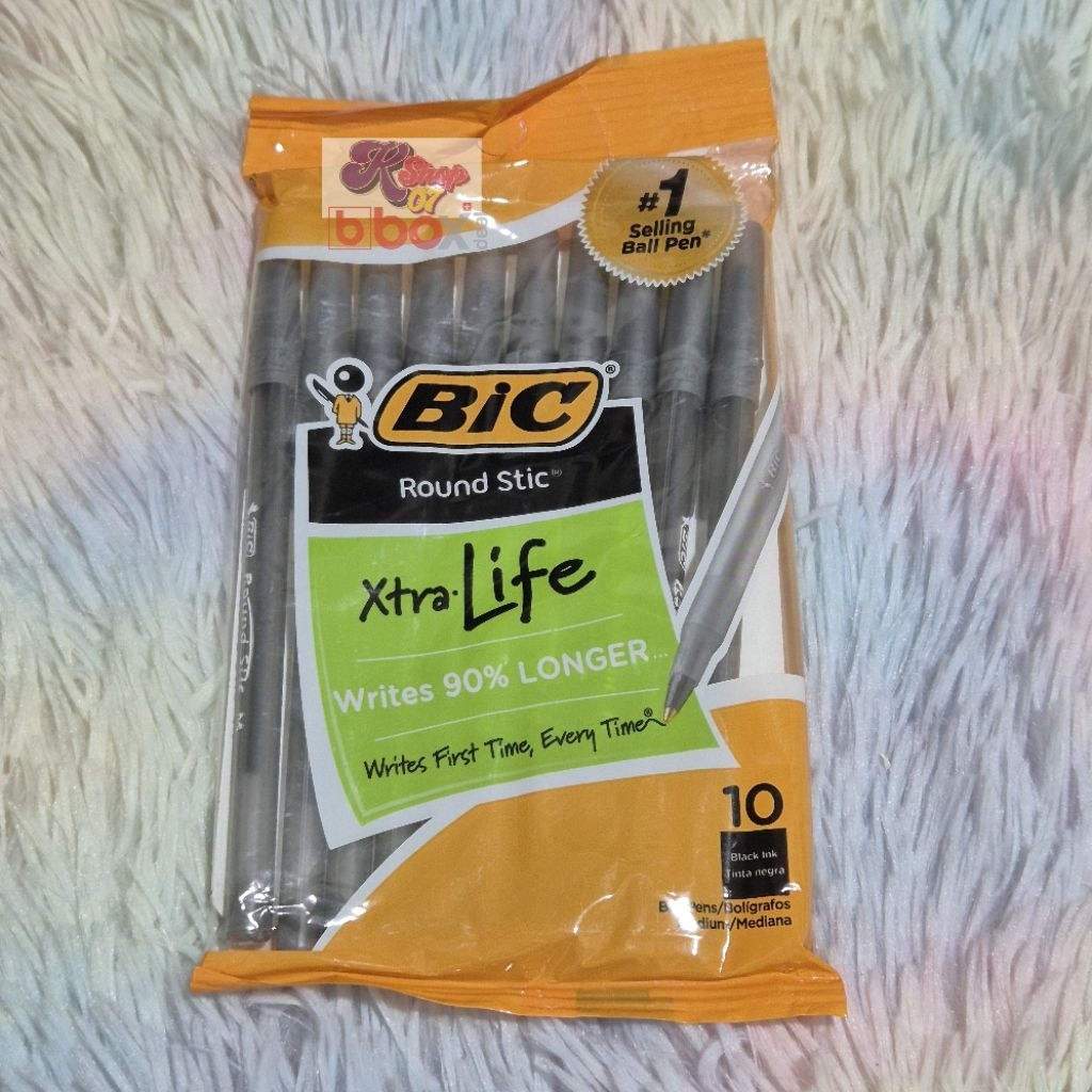 BIC ROUND STIC XTRA LIFE BLACK BALLPOINT PENS MEDIUM PT 1.0MM 10CT FLEXIBLE ROUND BARREL FOR COMFORT