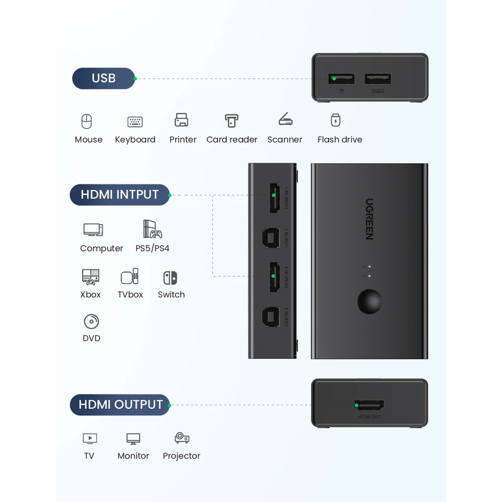 UGREEN HDMI-compatible KVM Switch 4K@60Hz USB 2.0 Switcher 2 in 1 Out for Printer Monitor Mouse