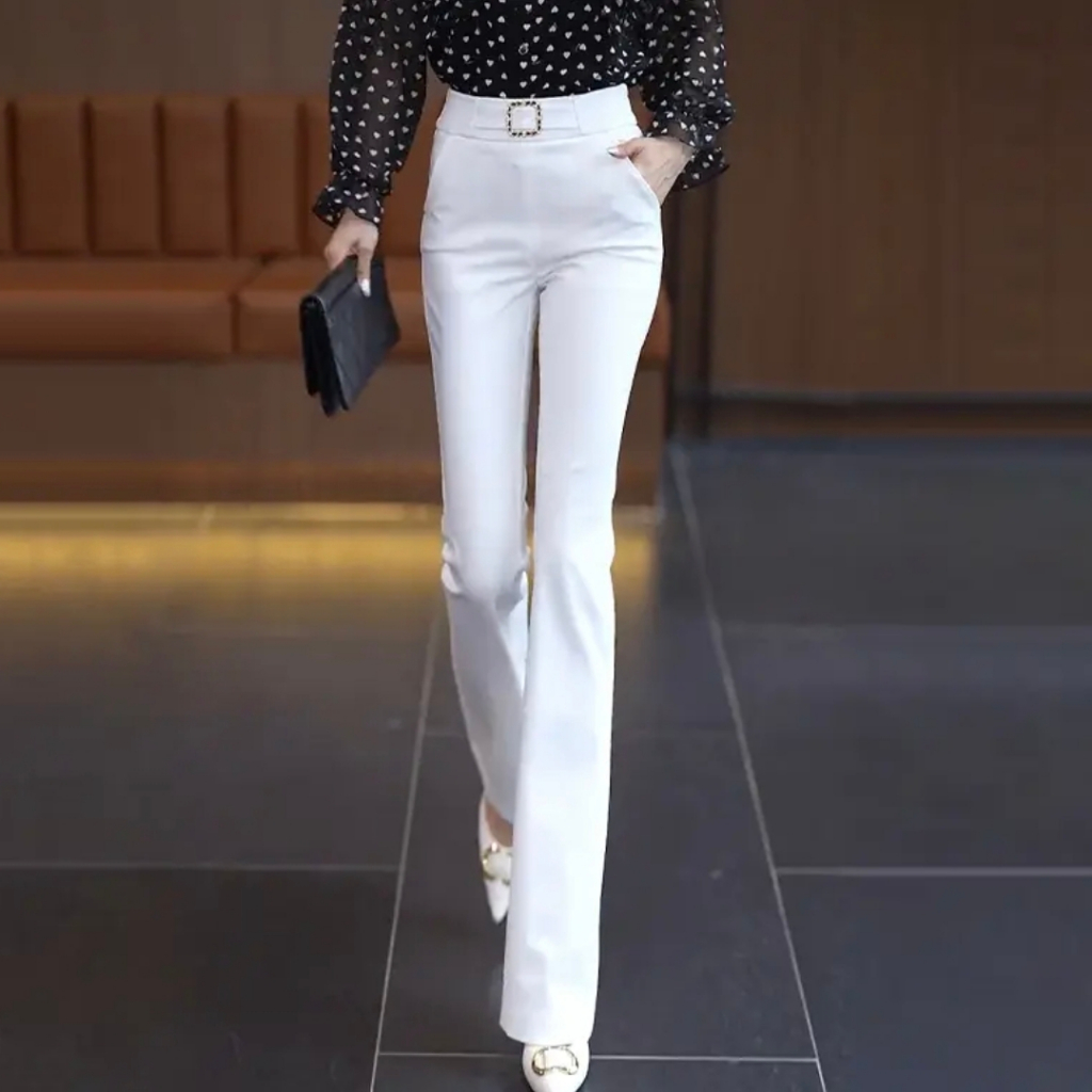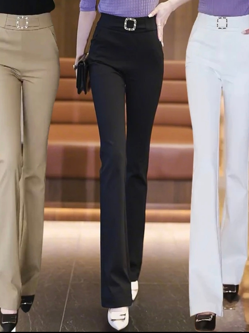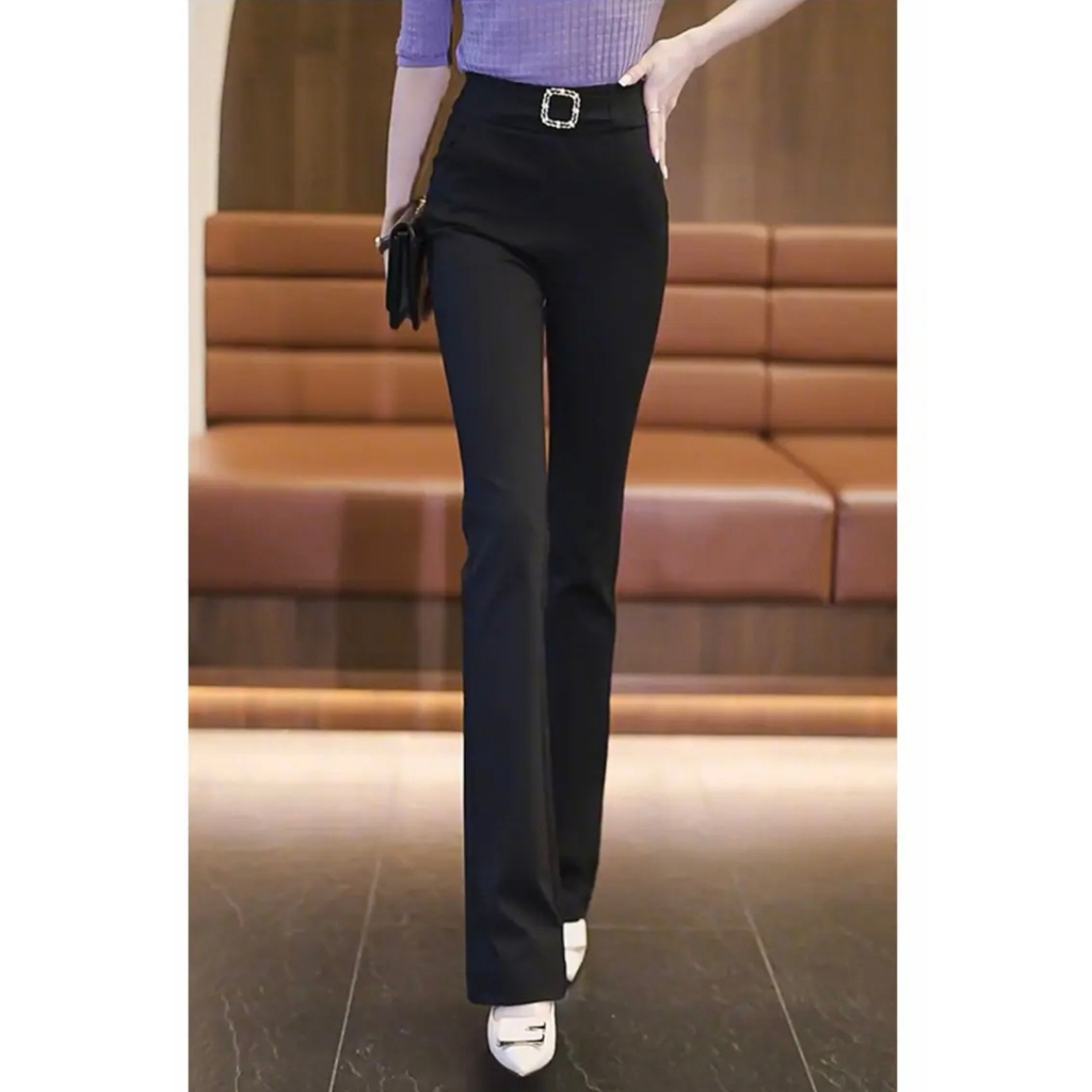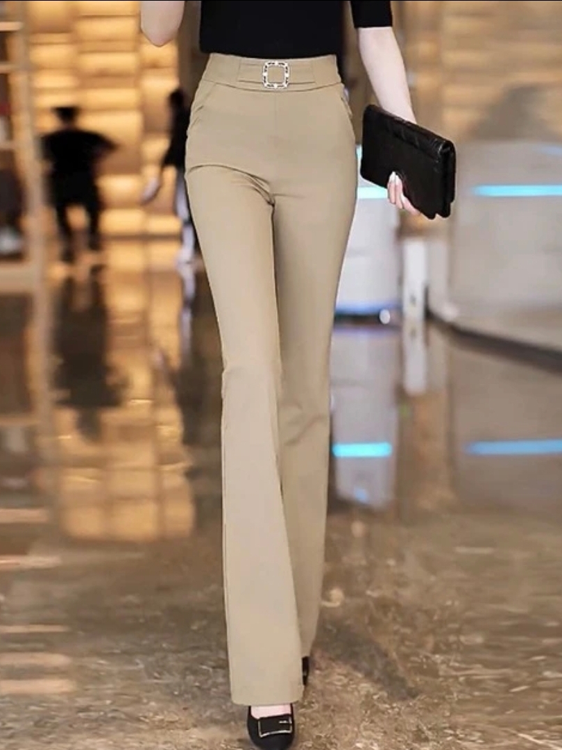 High Waist Bell- bottoms Elegant Plain Metal Buckle Office Formal Pants