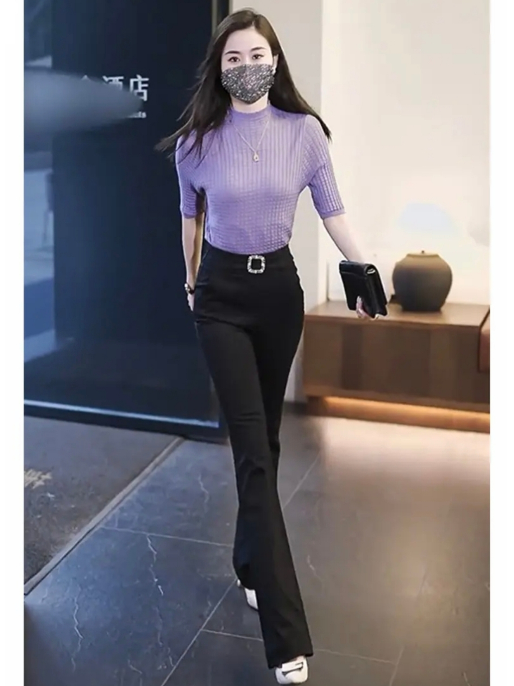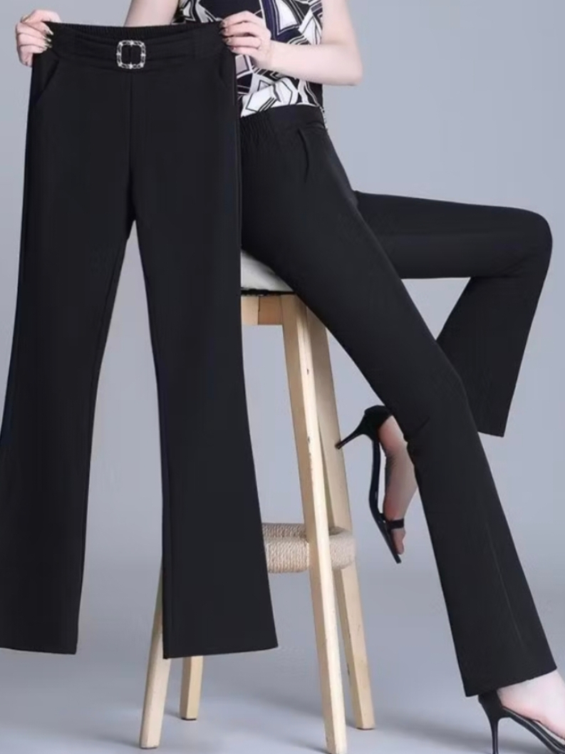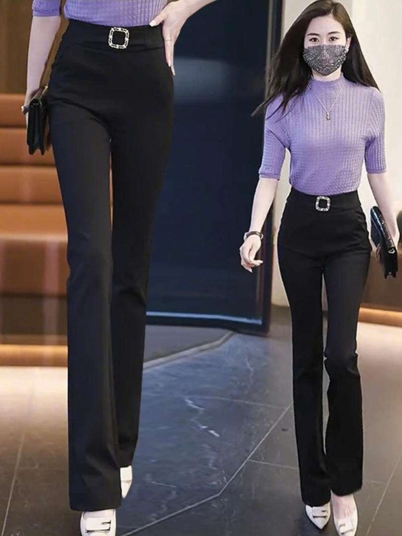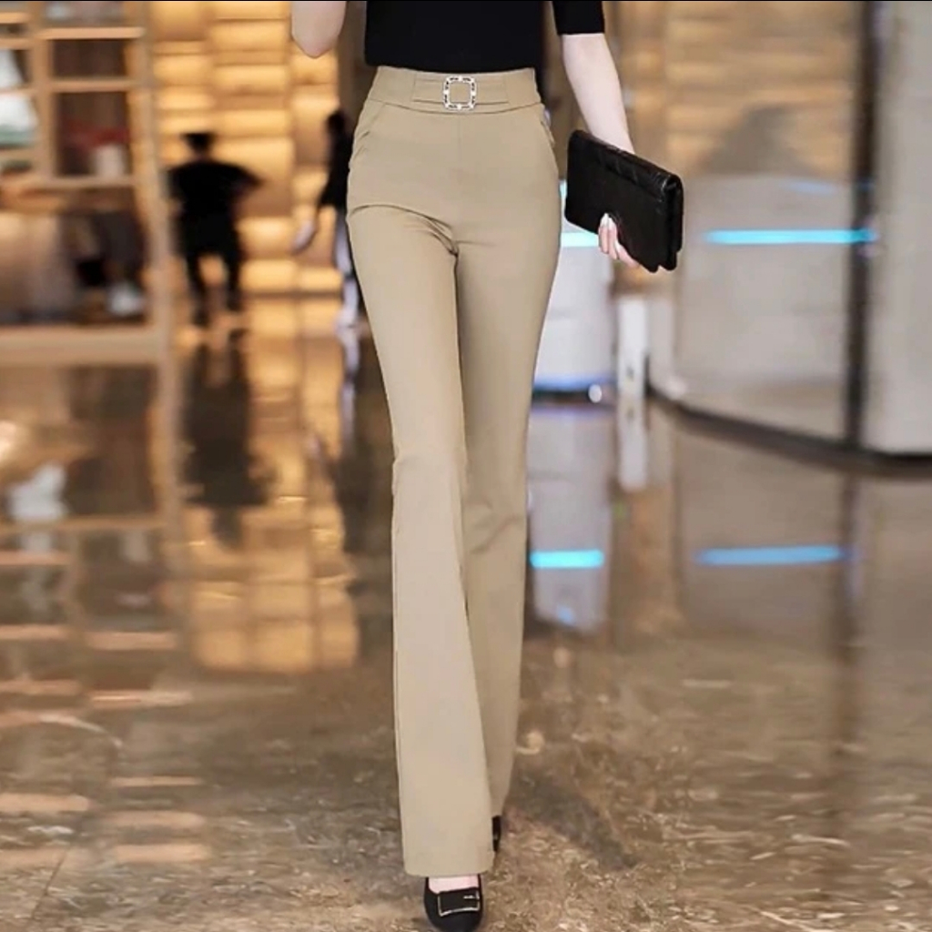 High Waist Bell- bottoms Elegant Plain Metal Buckle Office Formal Pants