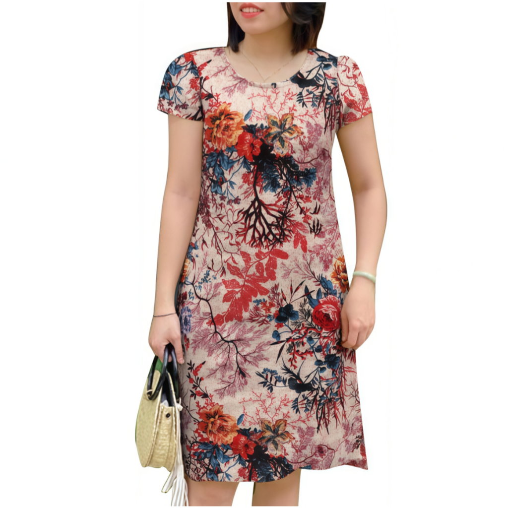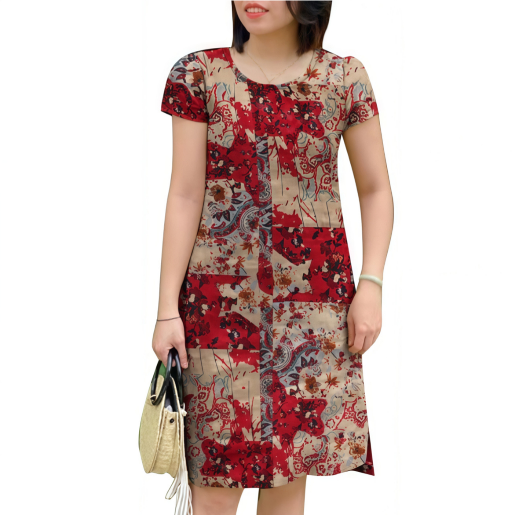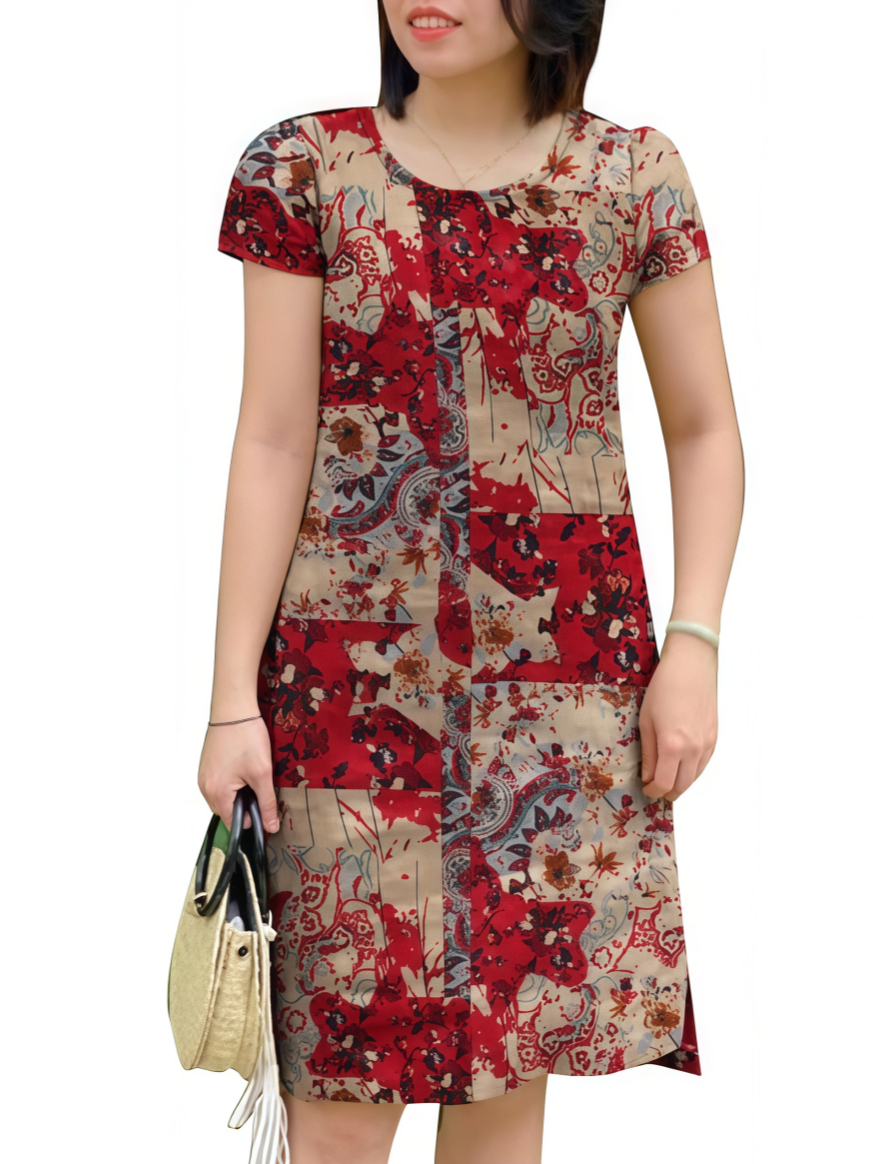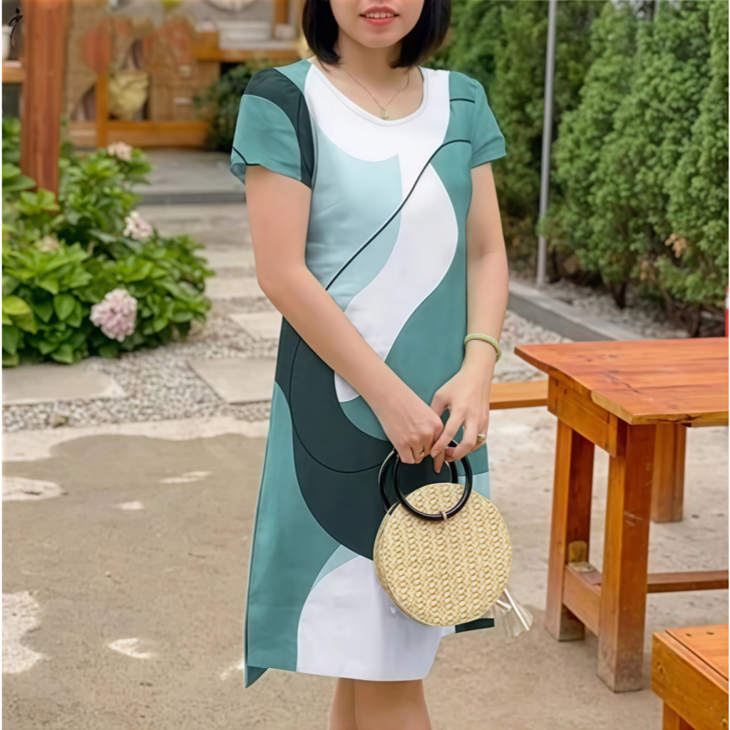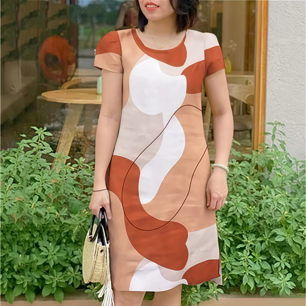 Women Geometric Pattern Dress Casual Korean Loose Short Sleeve O-Neck Printing Midi Dress L2239