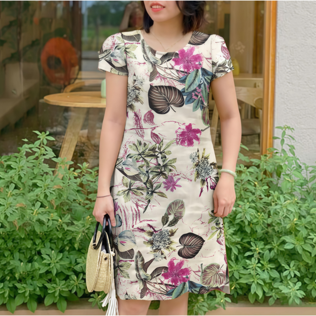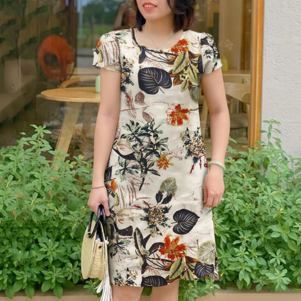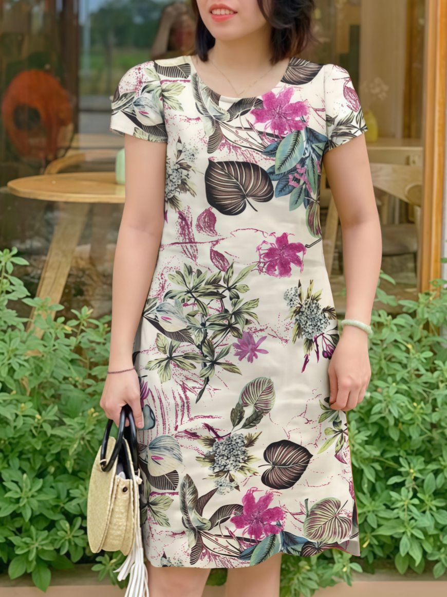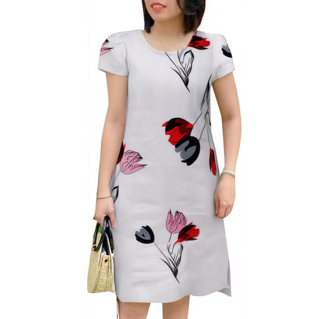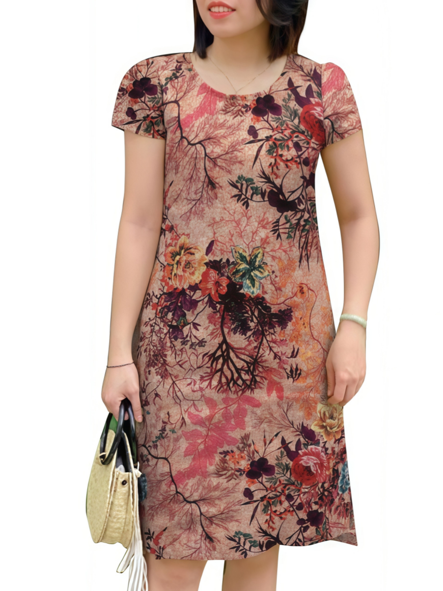Women Geometric Pattern Dress Casual Korean Loose Short Sleeve O-Neck Printing Midi Dress L2239