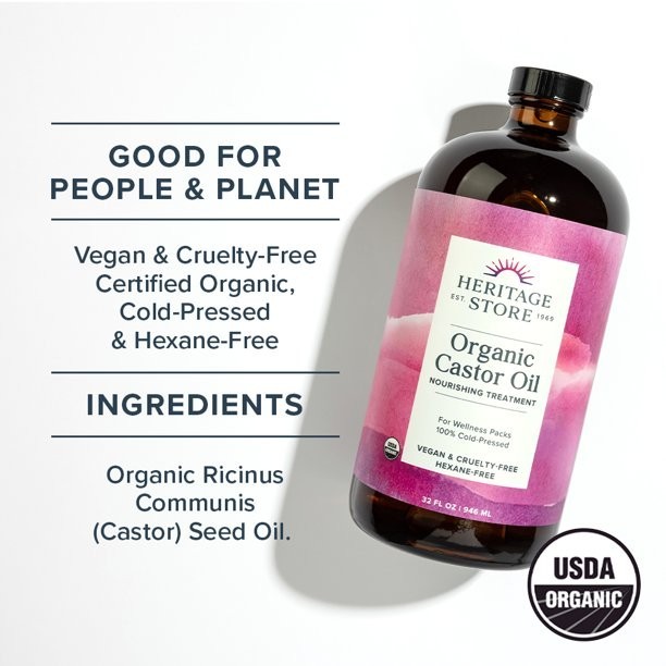 Heritage Store Organic Castor Oil Treatment 100% Cold-Pressed for Hair Skin Lashes and Brows (16oz)