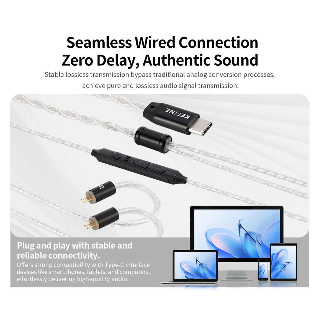 KEFINE Silver Plated Detachable Cable for Klean Hifi Wired Earphone IEM USB C with Mic 0.78mm 2 pin