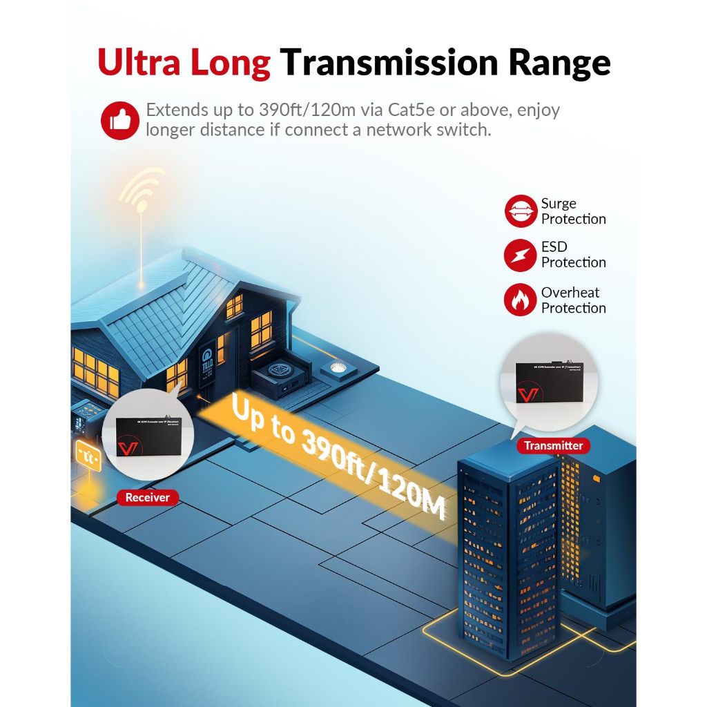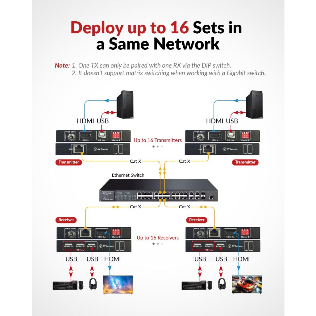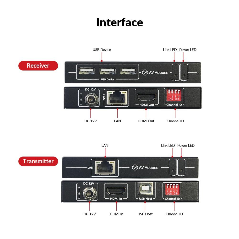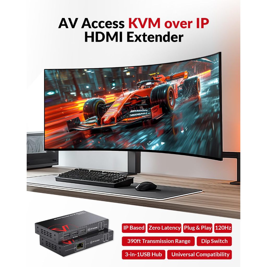 AV Access 4K HDMI USB KVM Extender TCP/IP Over Single Cat5e/6/6a/7 up to 120M(390ft), 1080P@120Hz, Plug & Play, Keyboard & Mouse Over Network, Zero Latency, 3 USB Hub(4KIP100-KVM)
