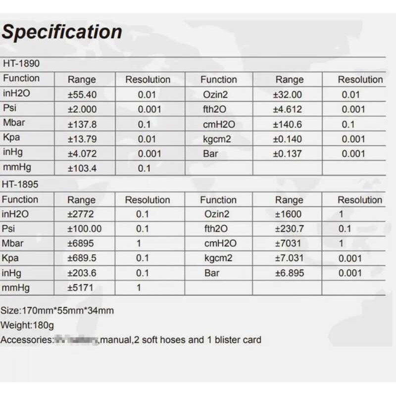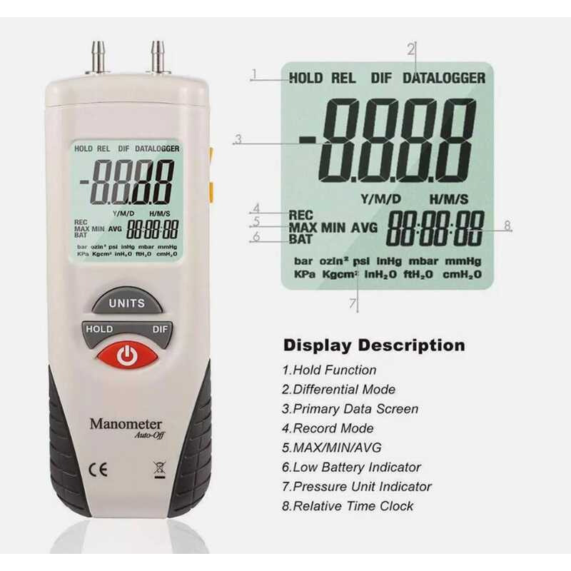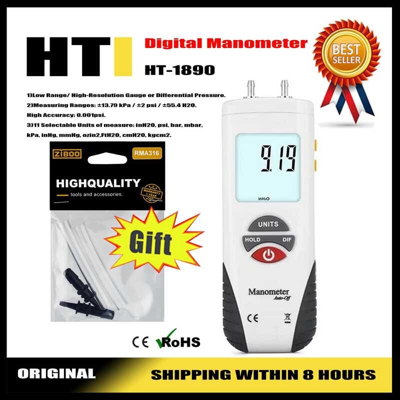 HTI 3 A Ht-1890 Gas Pressure Gauge Manometer Handheld Digital Data Hold Dual Port Air