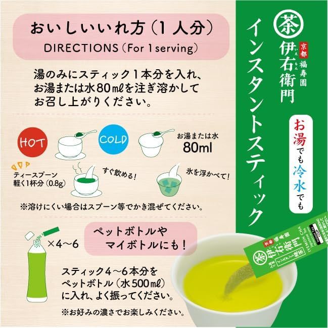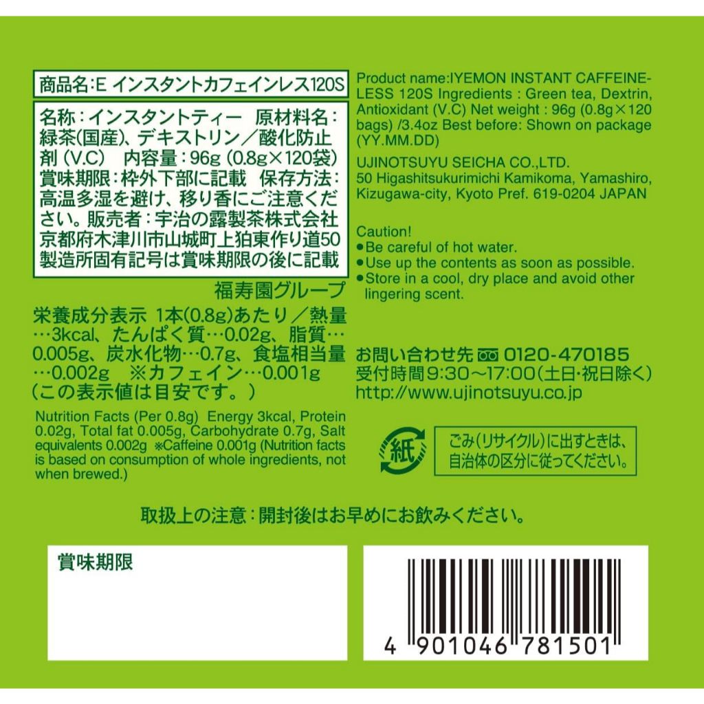 [From Japan]Iyemon Caffeine-Free Instant Green Tea Stick Decaf/Non-Caffeinated Powder 0.8g (120 sticks)