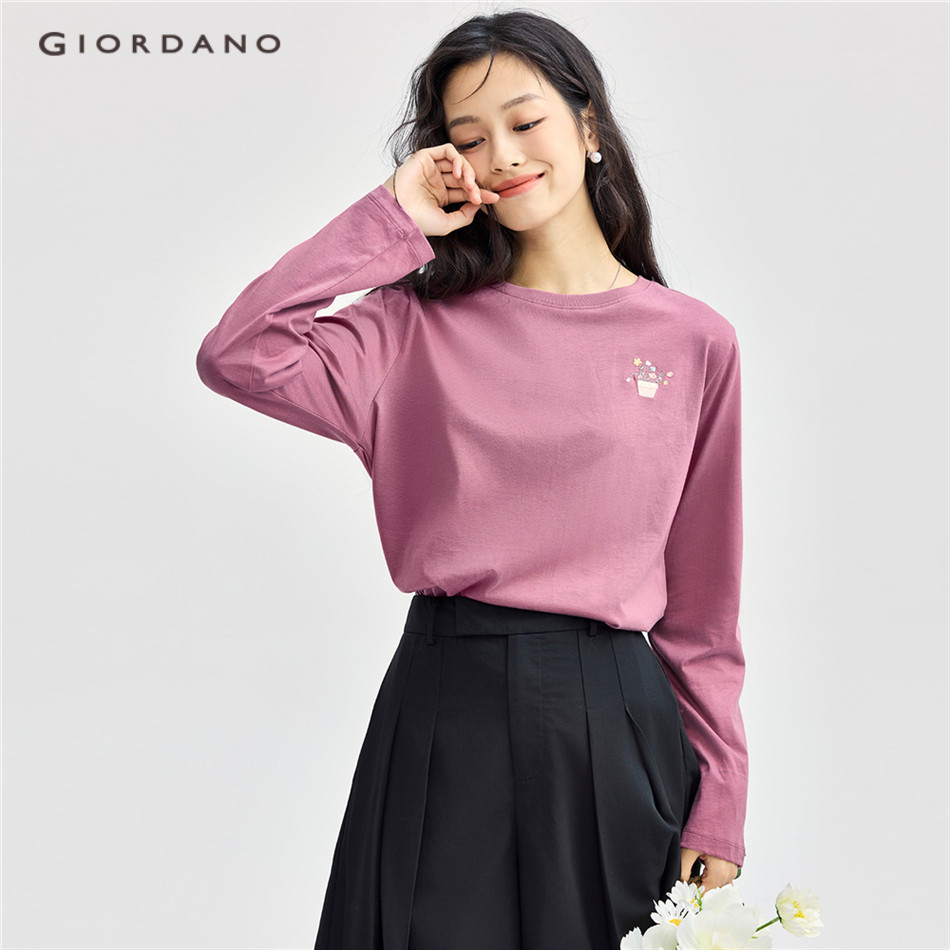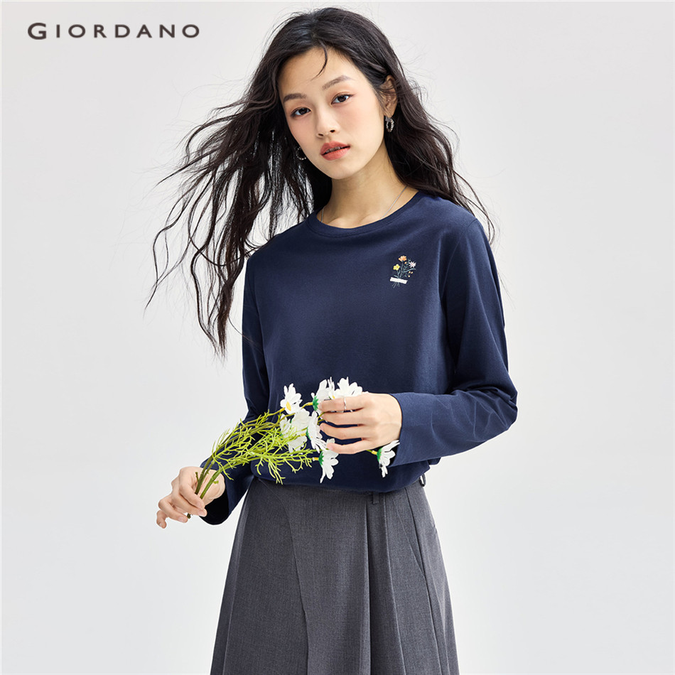 GIORDANO WOMEN 100% Cotton flower embroidery long sleeve tee 13324792