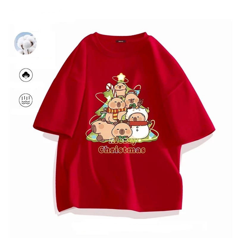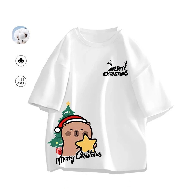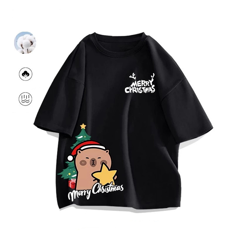100%Cotton Men Merry Christmas Capybara Top Oversized Short Sleeve Tee Unisex Printed Couple T-Shirt