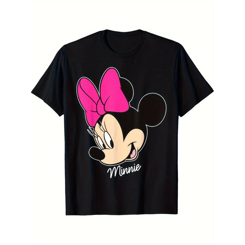 Disney Women S Minnie Mouse Big Face Graphic T Shirt Soft Black Casual Short Sleeve Tee With Pink Bo