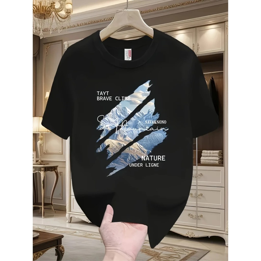 Men S Casual Nature Inspired Graphic T Shirt Black with Mountain Tree Design Short Sleeve Crew Neck