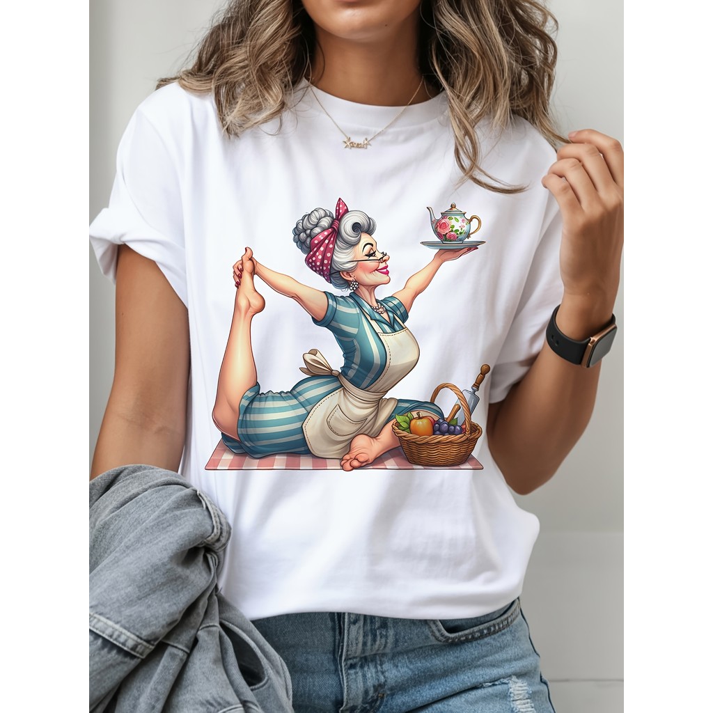 Women's Vintage Grandma Graphic T-Shirt-White Retro Tea Party Top with Elderly Lady Design-Soft Brea