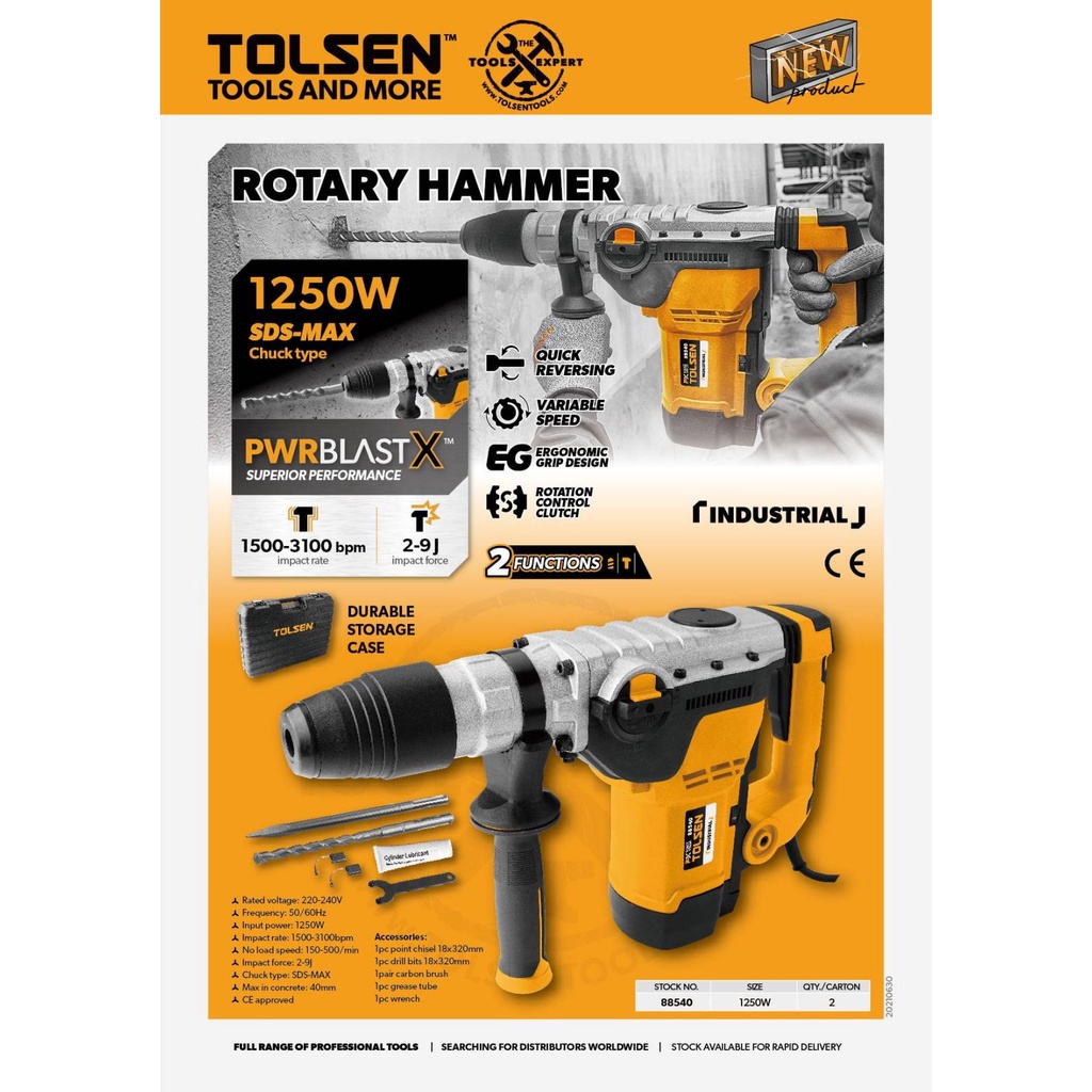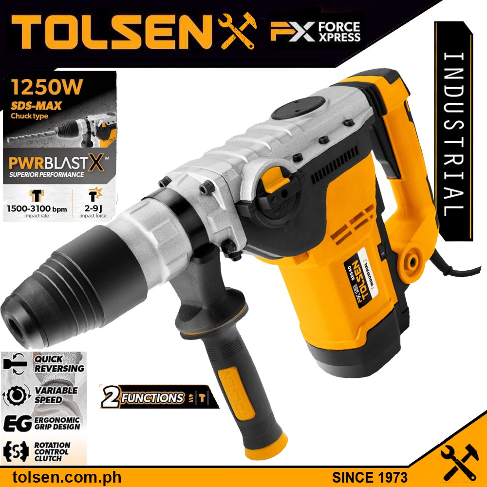 Tolsen Industrial SDS-MAX Rotary Hammer w/ 7pcs Accessories (1250Watts) PWRBLAST X