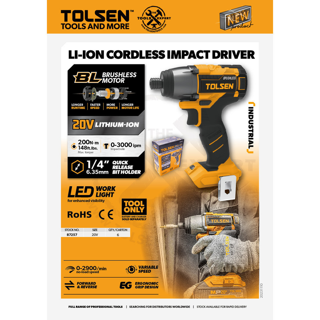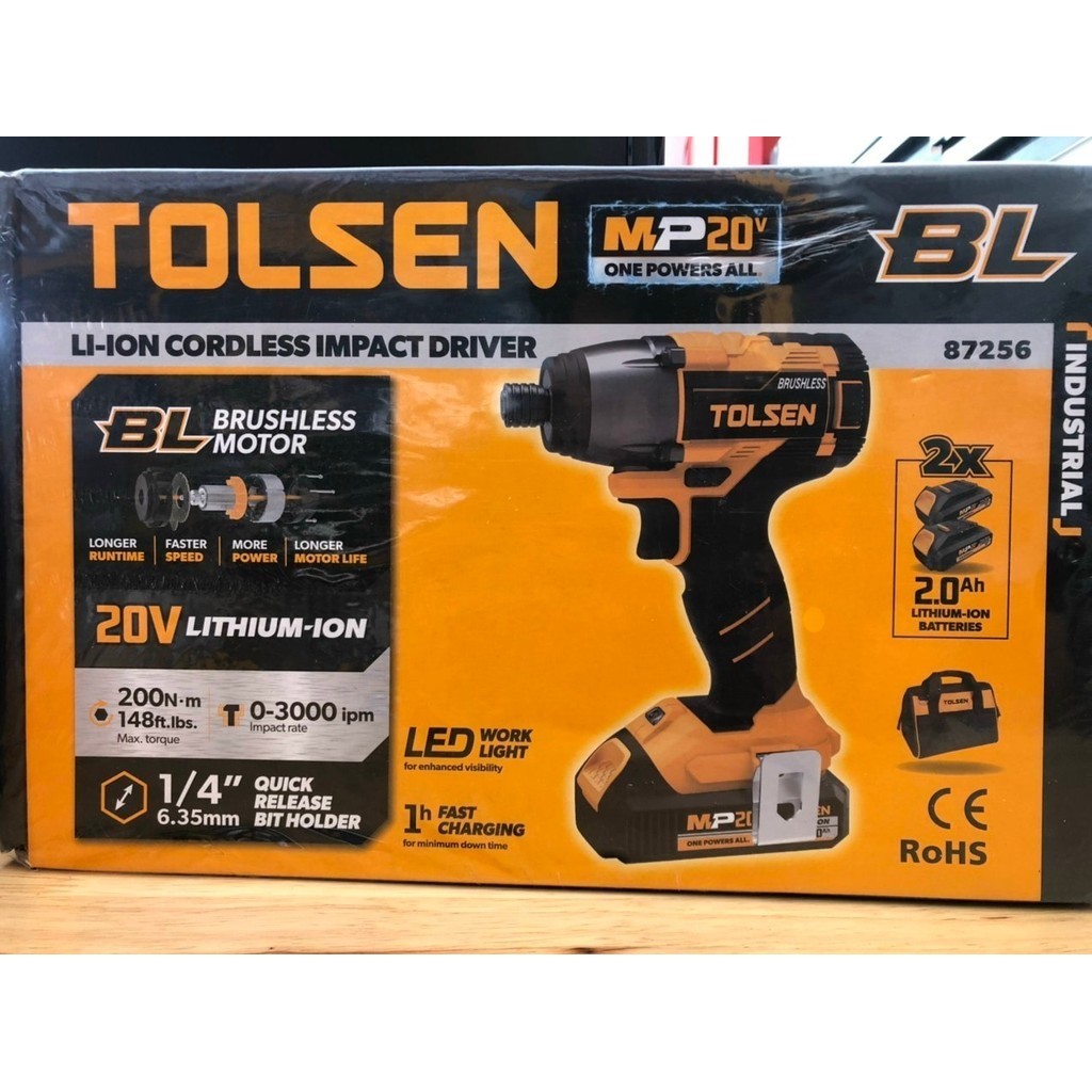 Tolsen LI-ION Brushless Cordless Impact Driver w/ 2 Battery & Bag (All in 1 20V Battery) CE Approved