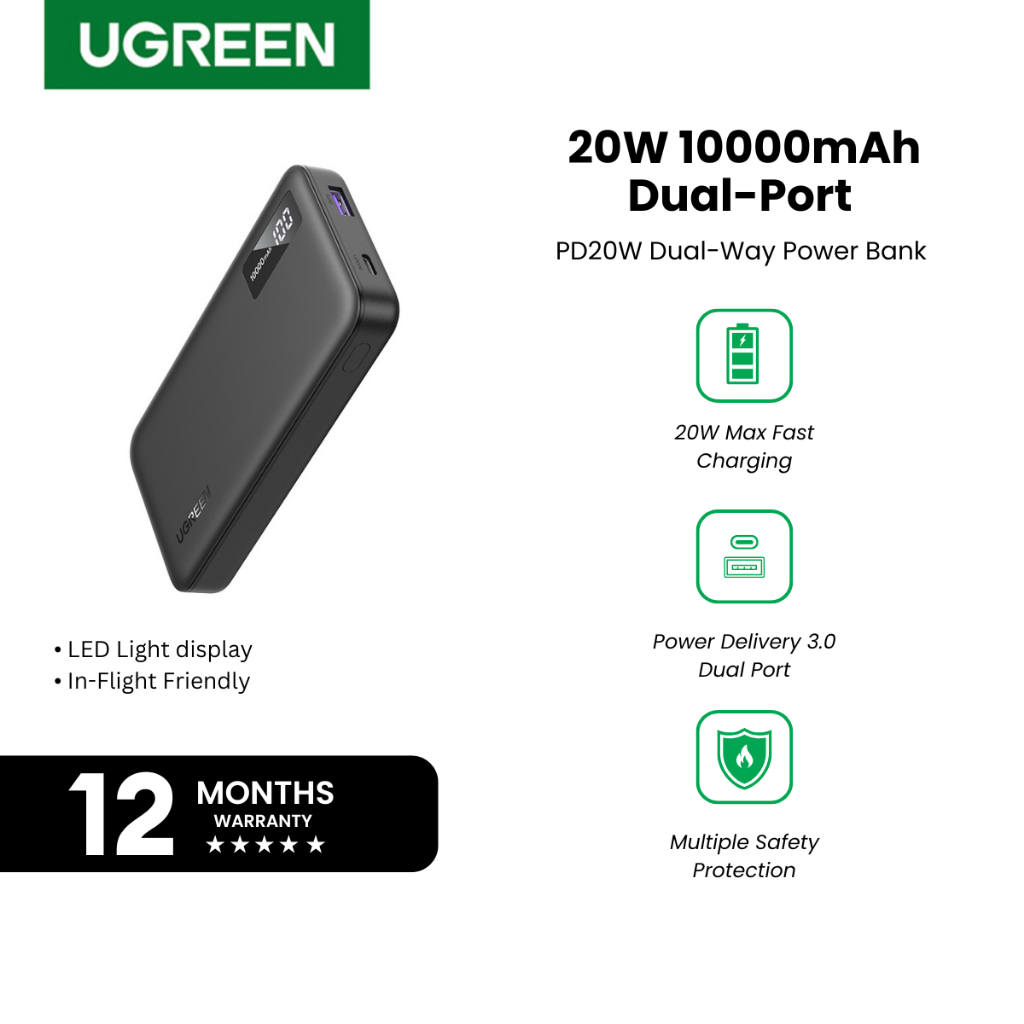 UGREEN 10000mAh Mini Power Bank 20W USB-C/USB-A PD/QC Fast Charging for iPhone, Samsung, Laptop