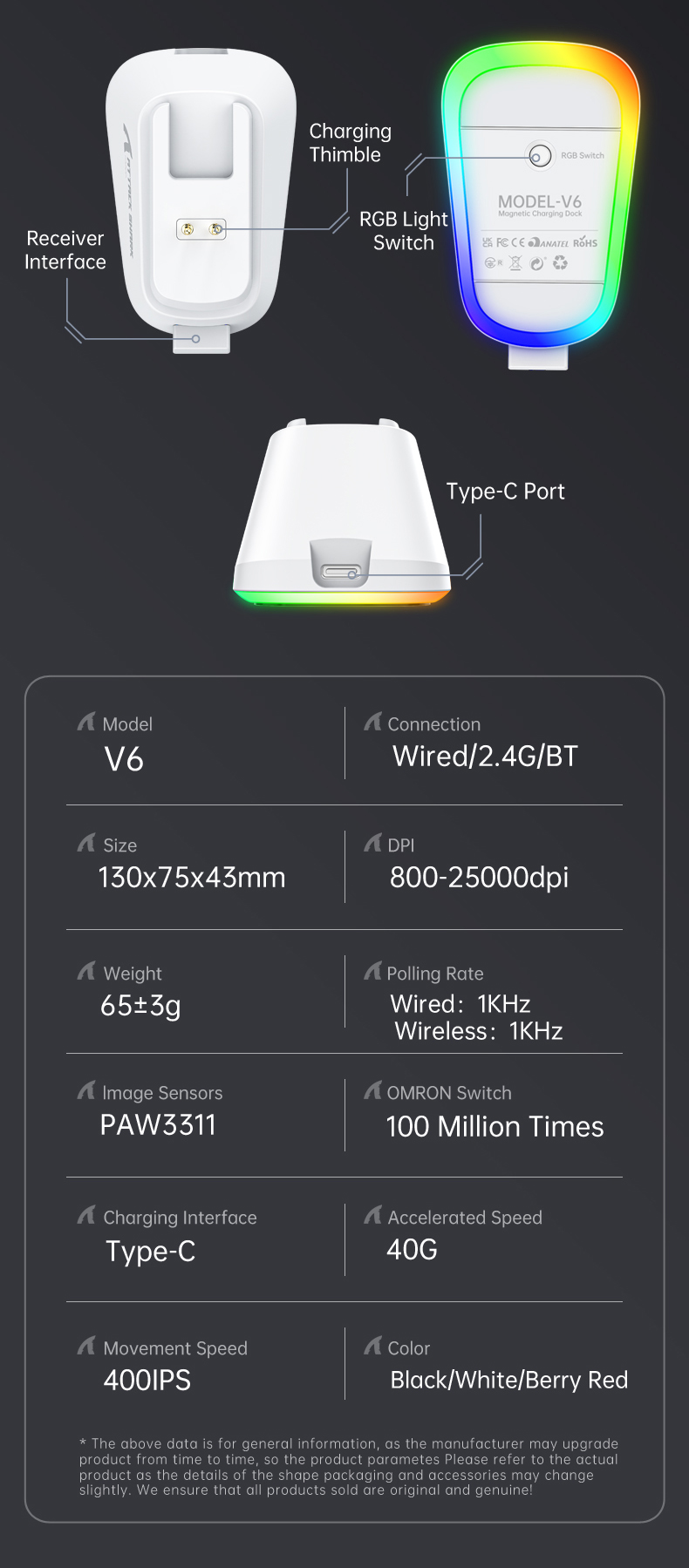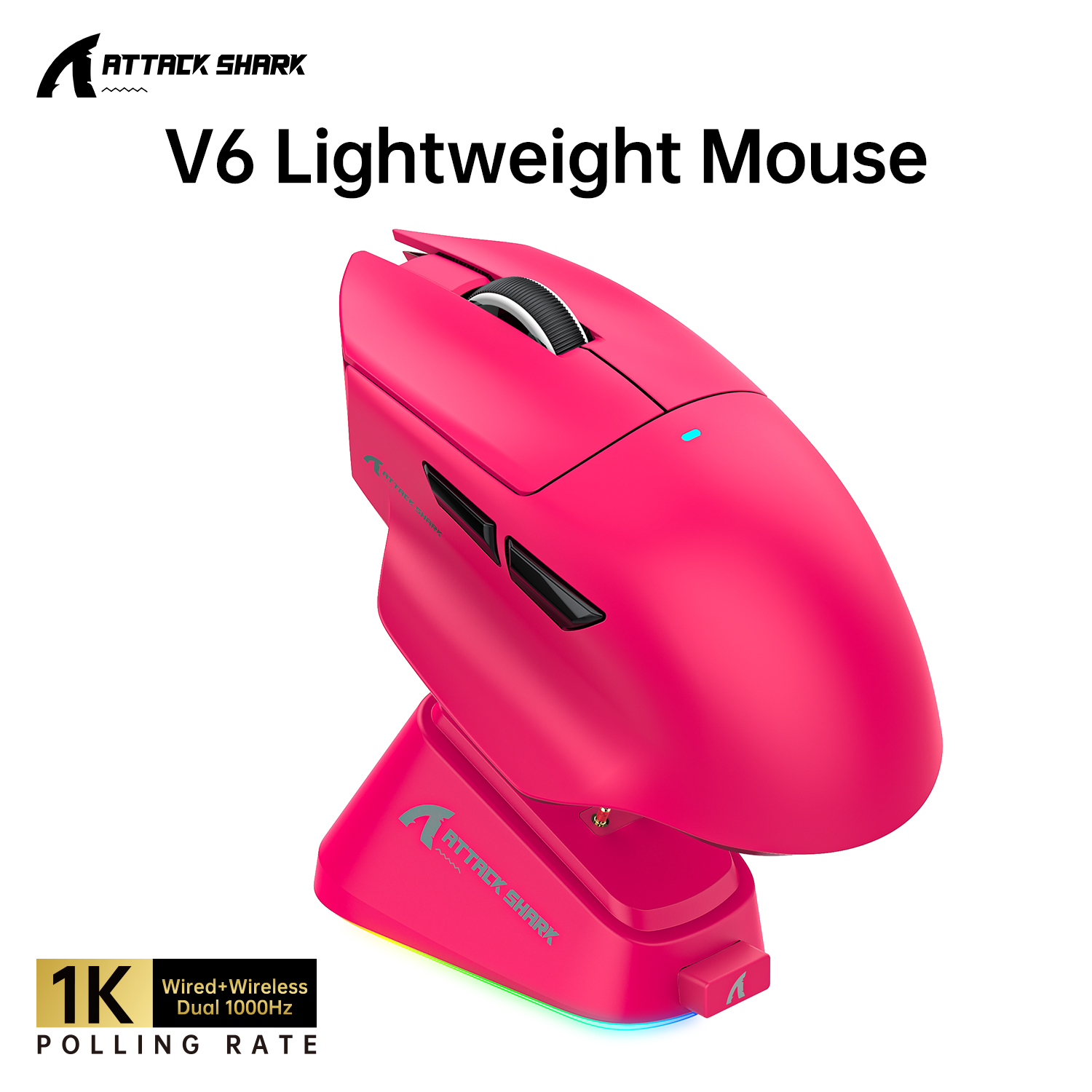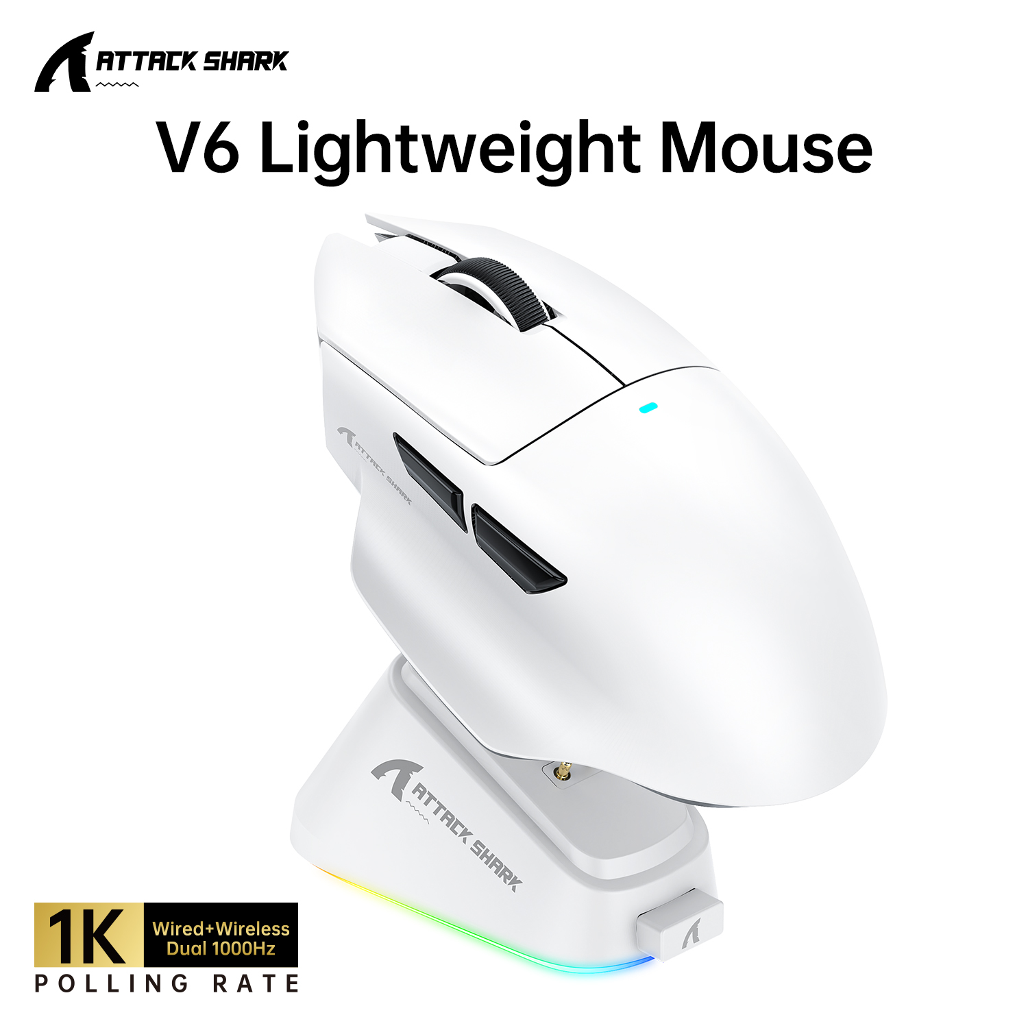 Attack Shark V6 Tri-Mode Lightweight Mouse RGB Magnetic Quick-Charging Base,PAW3311,BK52820 MCU,1000Hz Polling Rate,500mAh