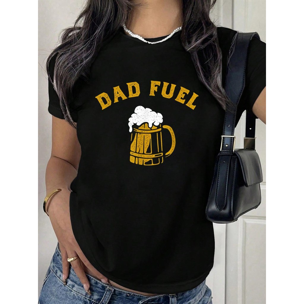 Funny Dad Fuel Beer Drinking Graphic Women s T Shirt Black with Yellow Print Casual Crew Neck Short