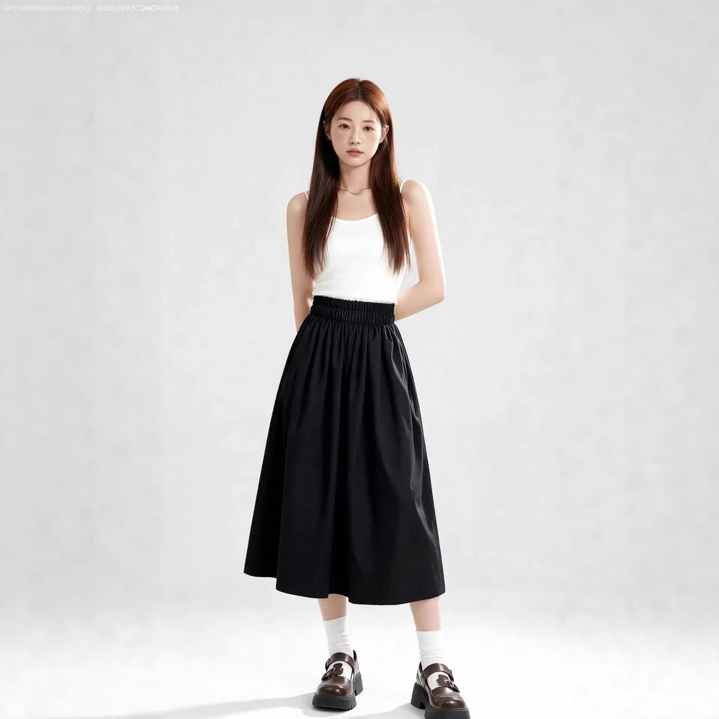Summer Solid Color Elastic Waist Summer Mid-Length Skirt Small High Waist All-Match Skirt Umbrella Skirt OTJY