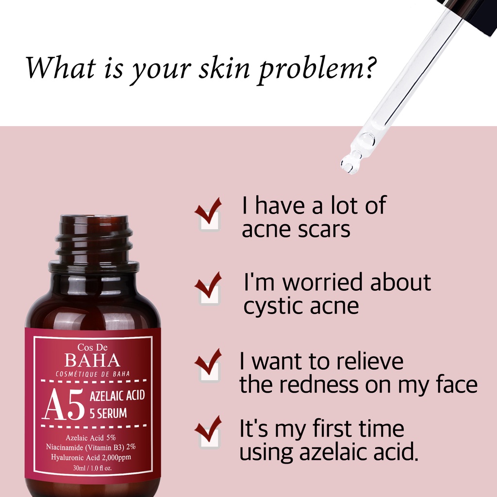 Cos De BAHA - Azelaic Acid 5% Facial Serum with Niacinamide - Fast Rosacea Skin Care Product + Reduce Cystic Acne Scar + Redness Relief Face + Pimple Pigmentation Blackhead, 30ml)
