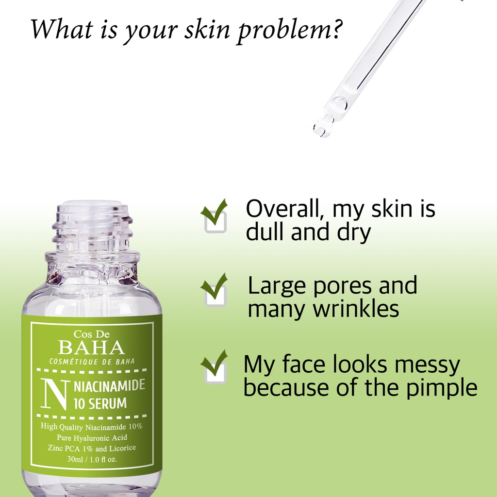 Cos De BAHA - Niacinamide 10% + Zinc 1% Essense Serum, 30ml/for Face/Neck - Tightens Pores, Reduces Wrinkless, Repairs Skin, Vitamin B3 Brightening Acne Pores Minimizer Oily Skie