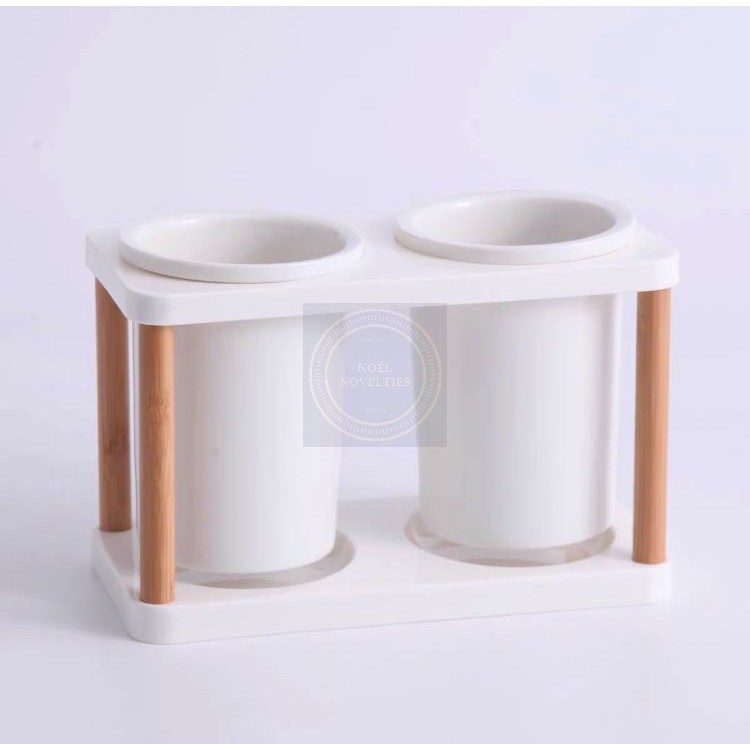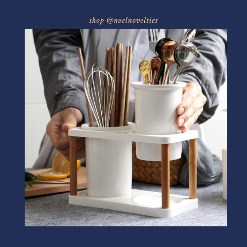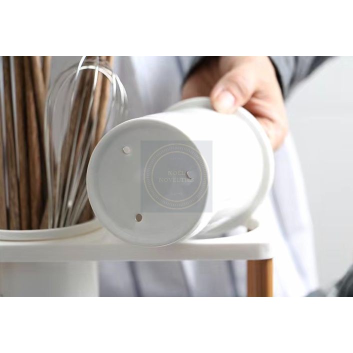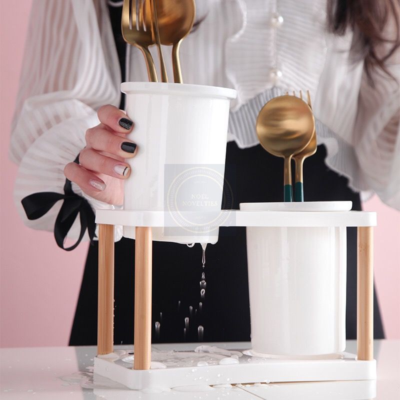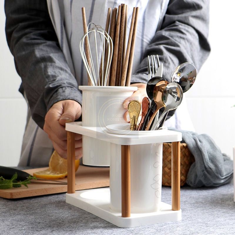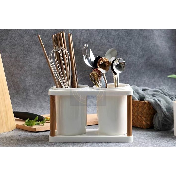 NN Ceramic & Wood Double-Barrel Cutlery Spoon and Fork Chopsticks Dinnerware Table Storage Organizer