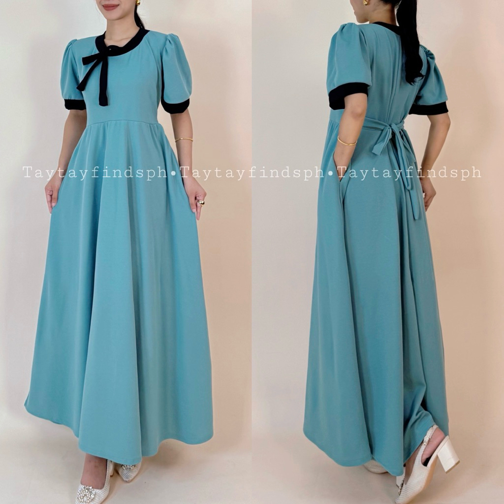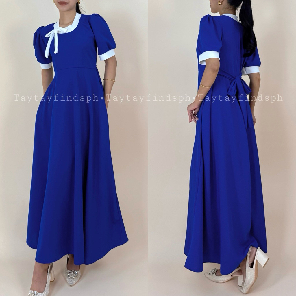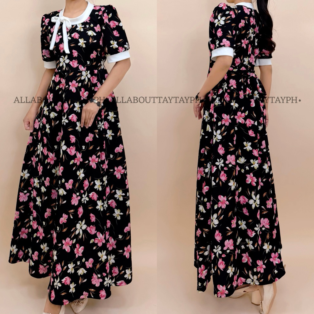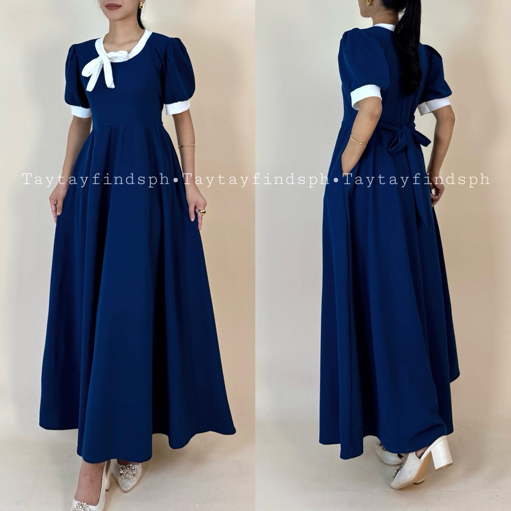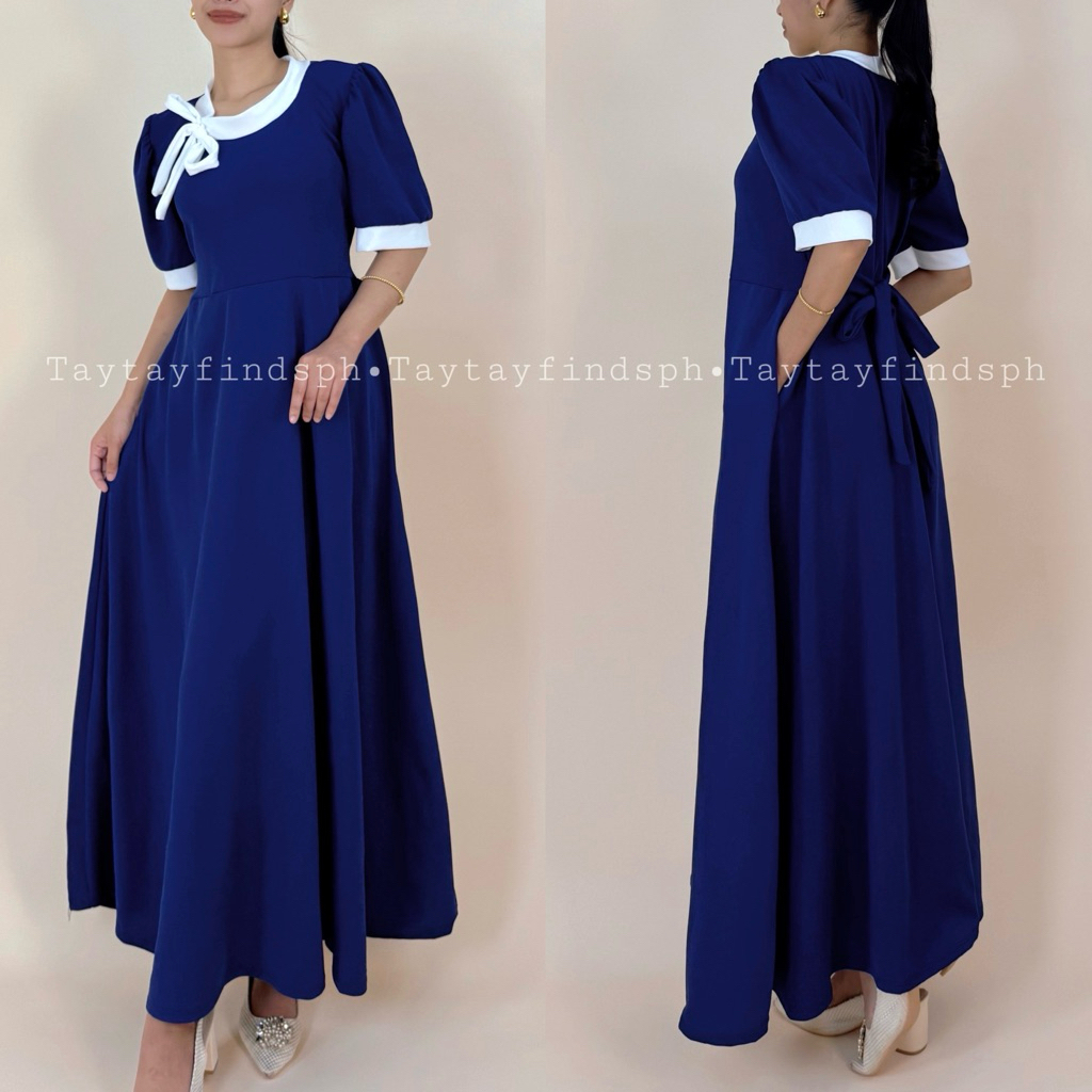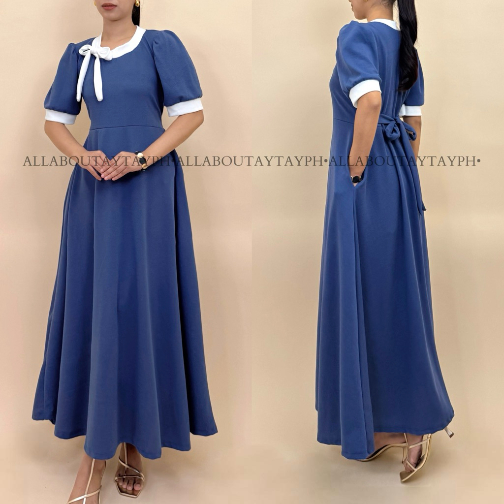 CLAIRE RIBBON TIE COLLAR COMBI CHURCH MAXI DRESS CREPE FABRIC