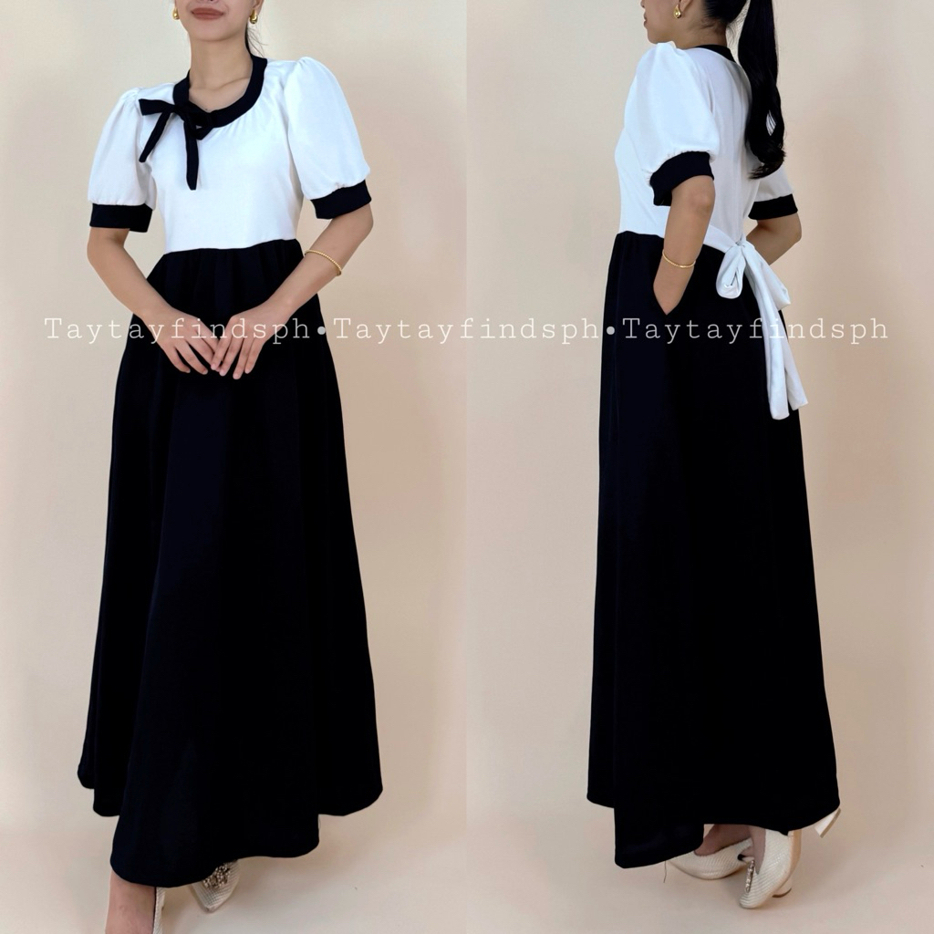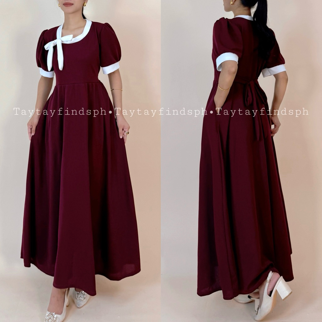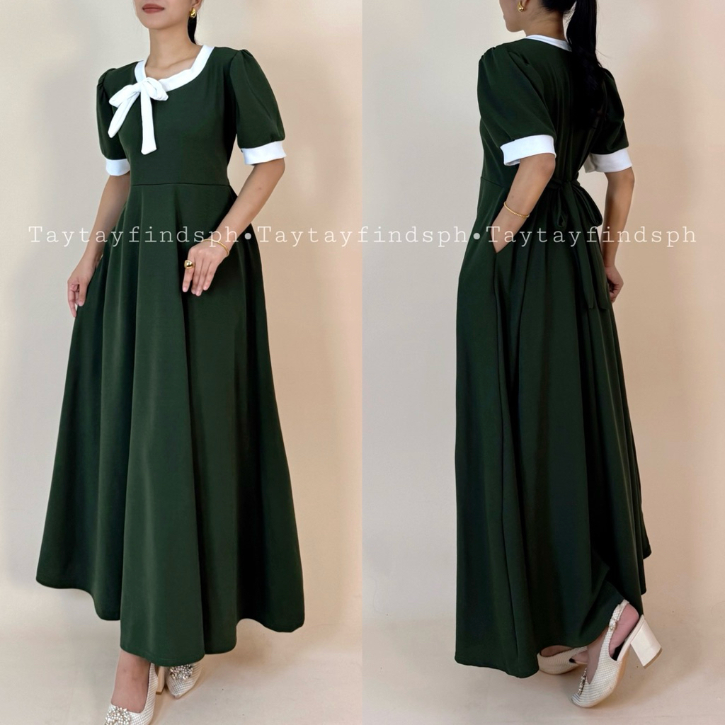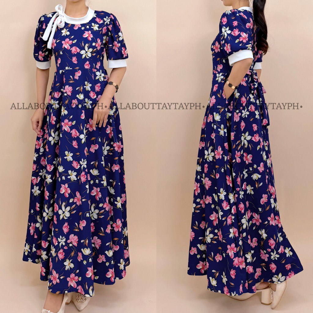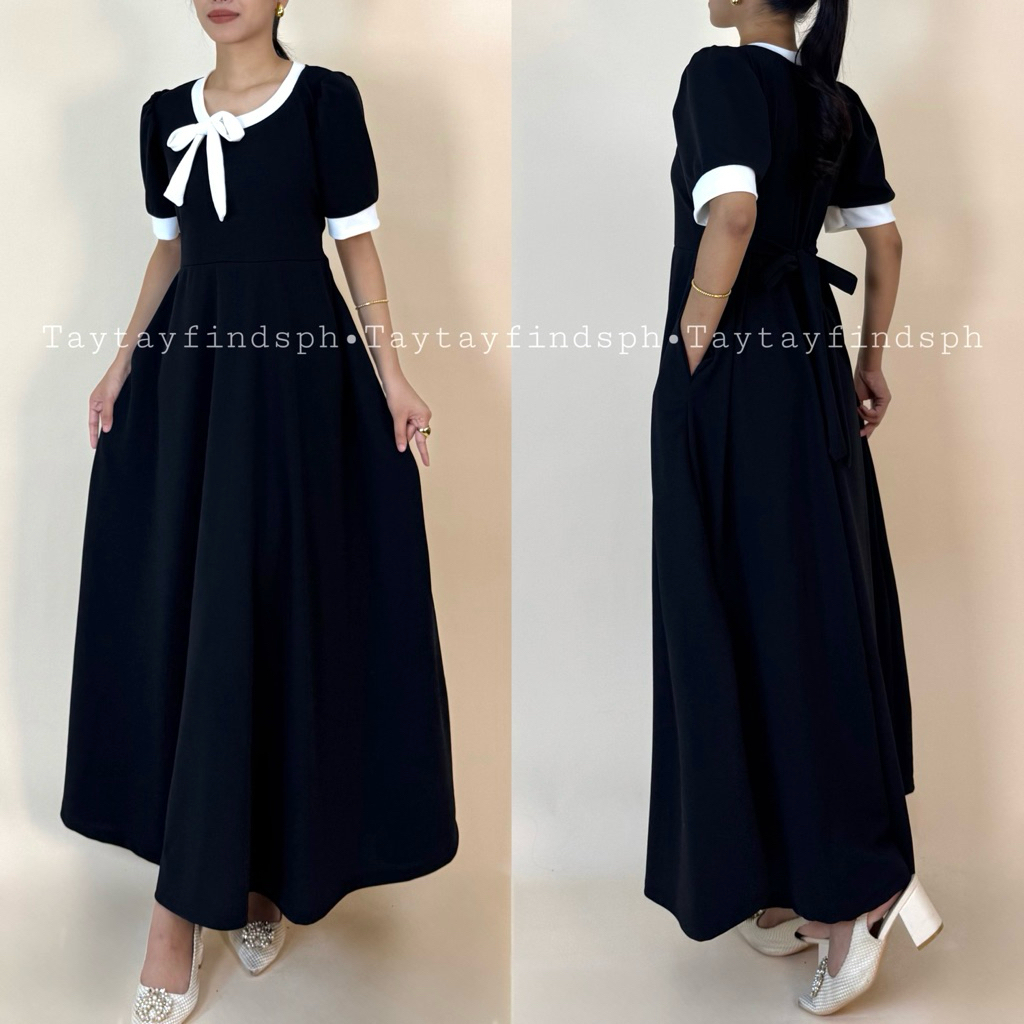 CLAIRE RIBBON TIE COLLAR COMBI CHURCH MAXI DRESS CREPE FABRIC