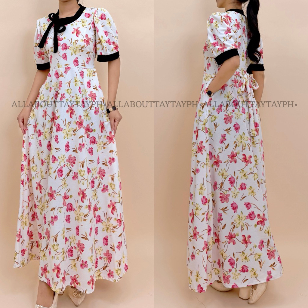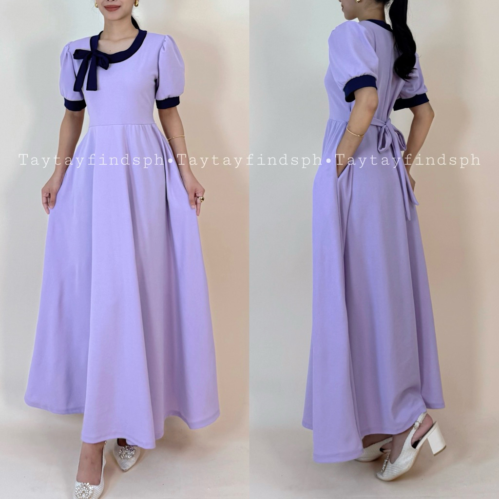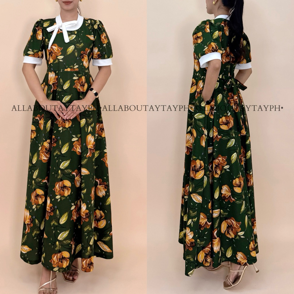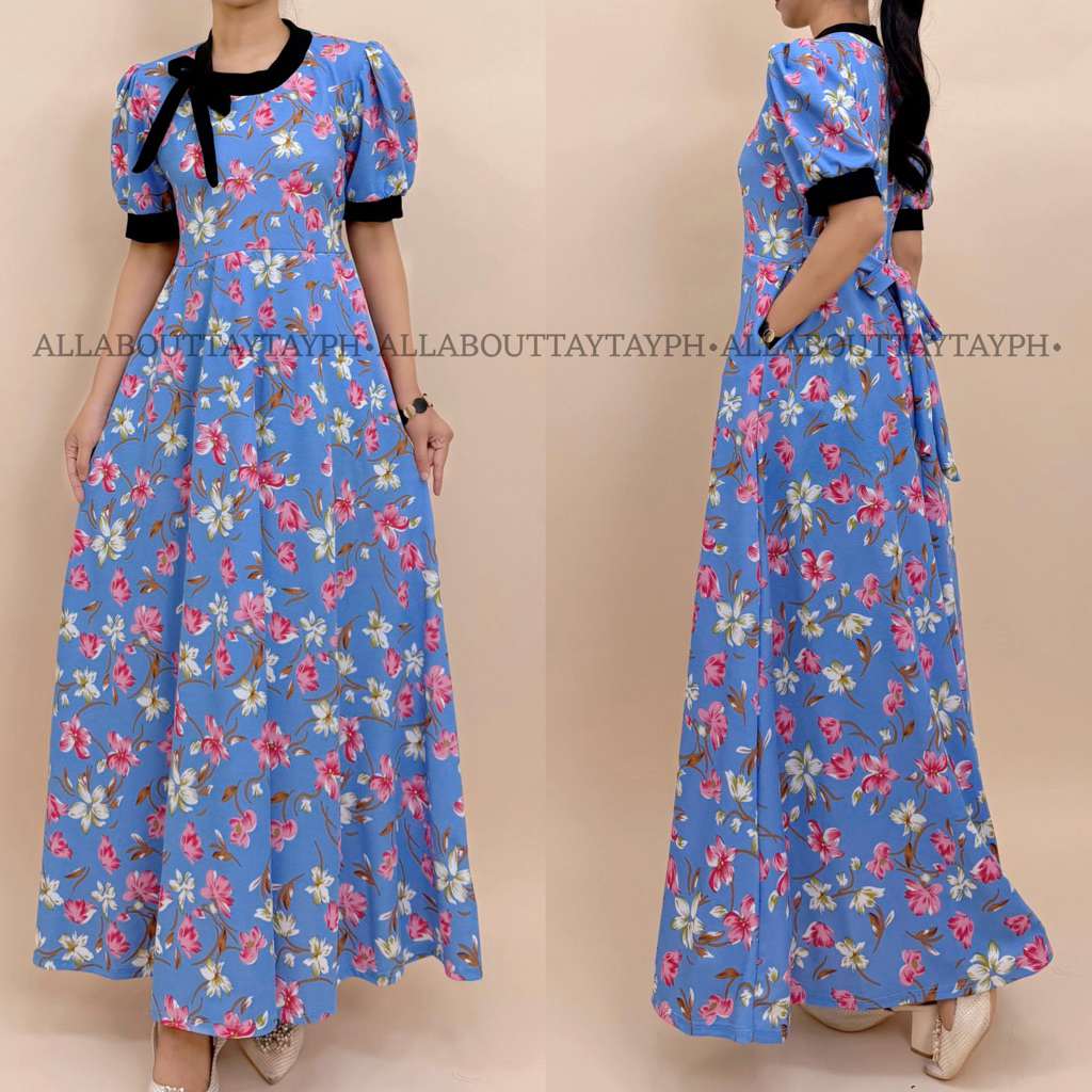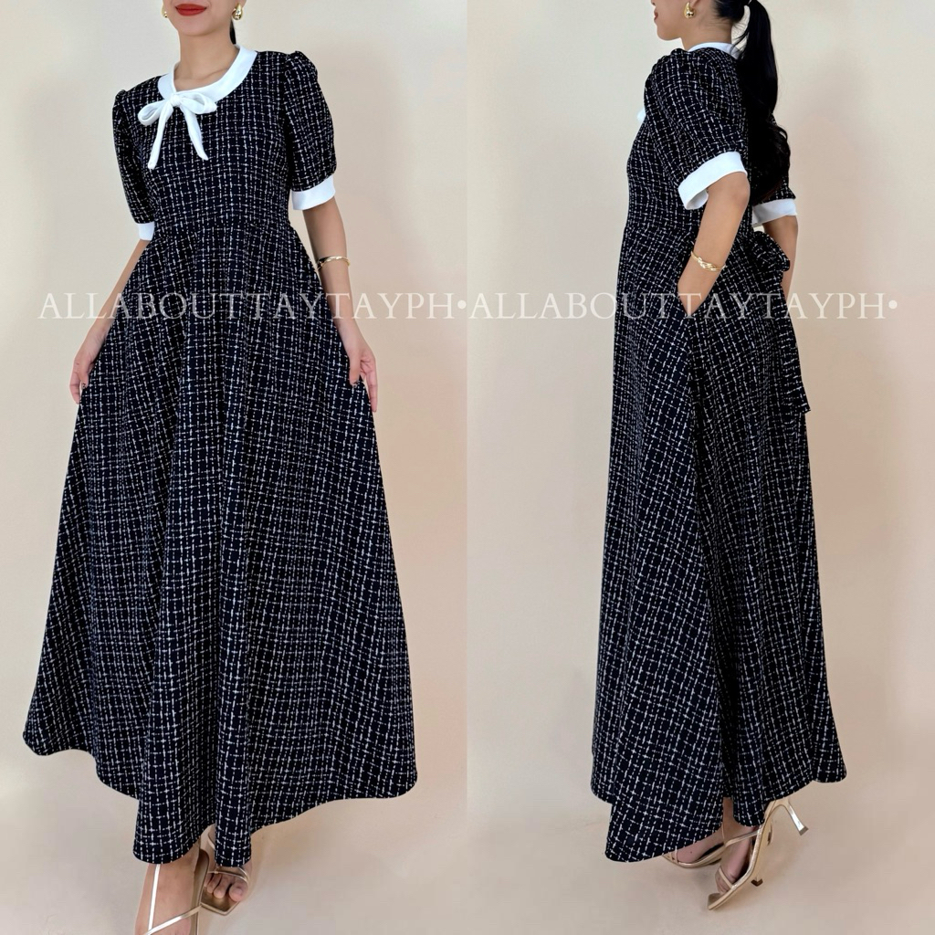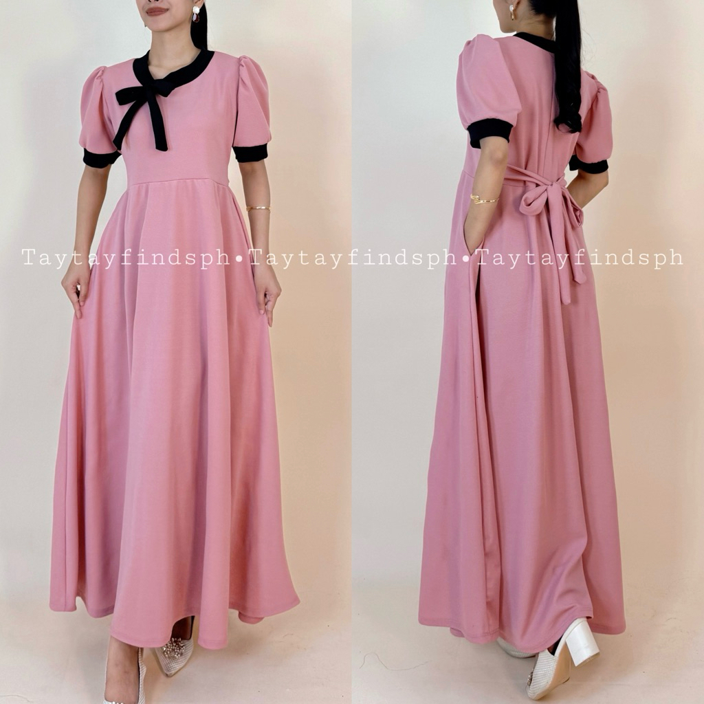 CLAIRE RIBBON TIE COLLAR COMBI CHURCH MAXI DRESS CREPE FABRIC